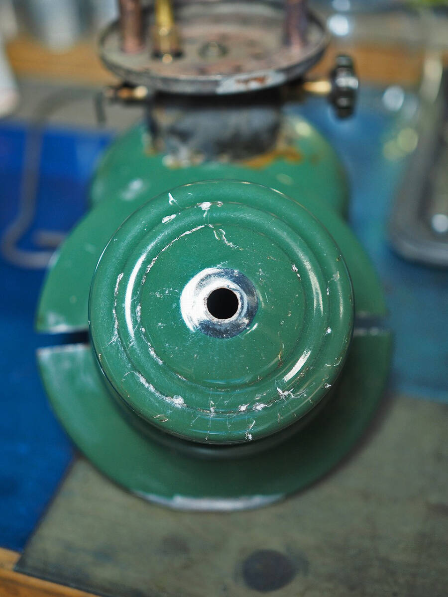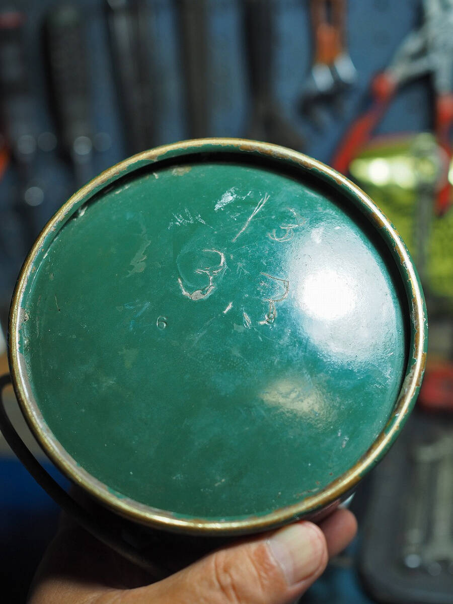このランタンが作られてから今までの時間を感じさせるような素晴らしいビンテージ感を持っていますが、特にタンクはグリーンの塗装のキズから見える真鍮の地肌が渋いです。