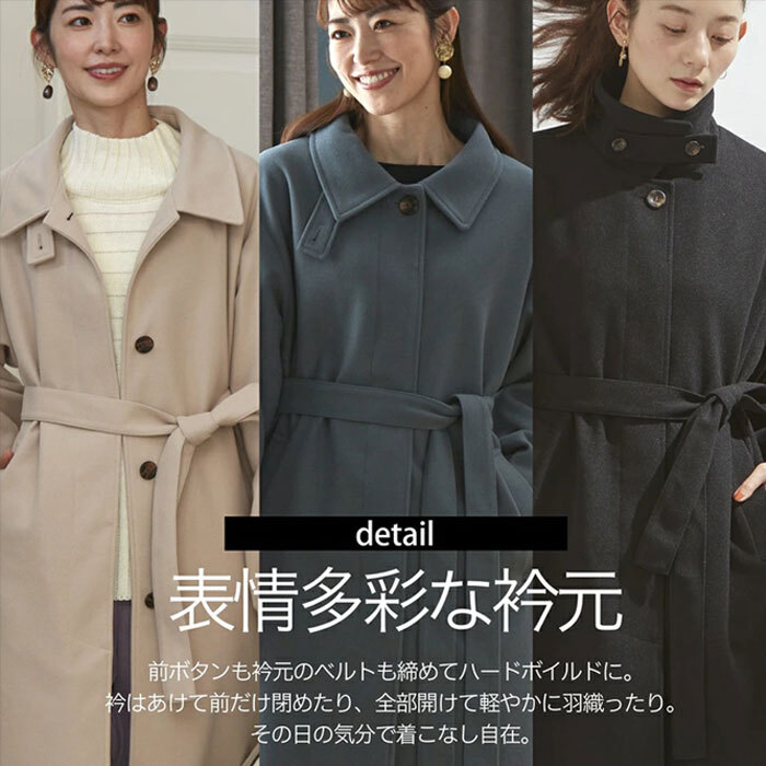 商品説明 | ・・着こなし自慢のハンサムコート ・ボリューム袖で女性らしさもひとさじ ・表も裏もこだわりの上質感 ・表地は暖かなウール見えする素材、裏地はすべりのよい素材で着心地よく仕上げました。 ・表情多彩な衿元 ・前ボタンも衿元のベルトも締めてハードボイルドに。 ・衿はあけて前だけ締めたり、全部開けて軽やかに羽織ったり。 ・その日の気分で着こなし自在。 ・袖コンシャス ・袖口にはタックを入れて丸みを持たせたシルエットがトレンド気分を盛り上げます。 |