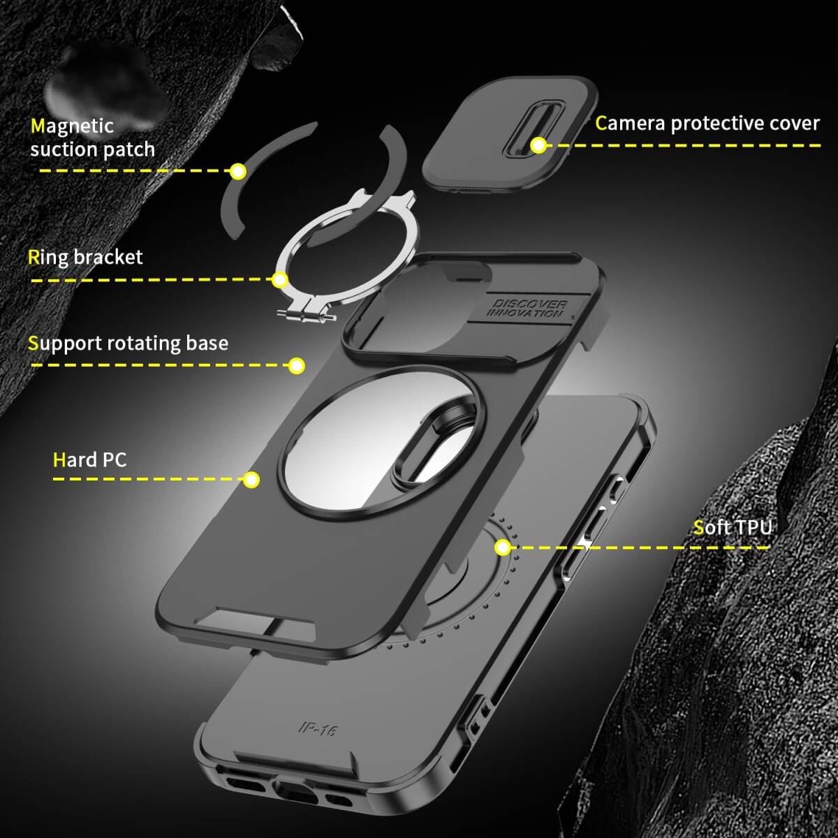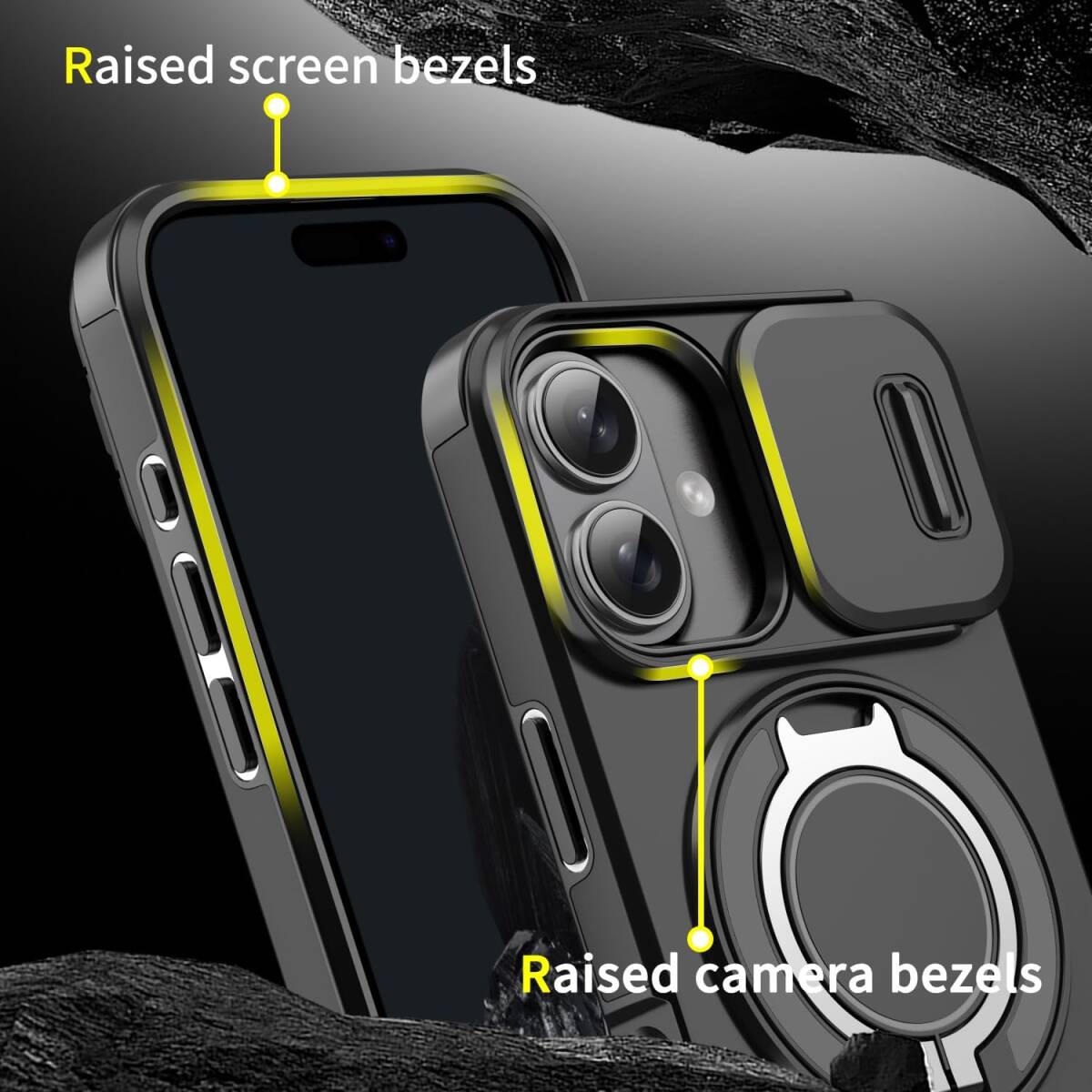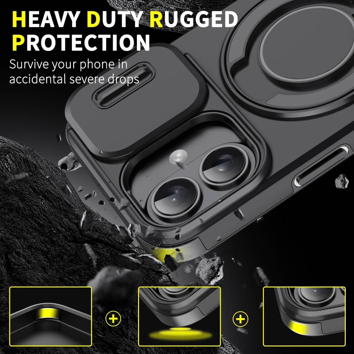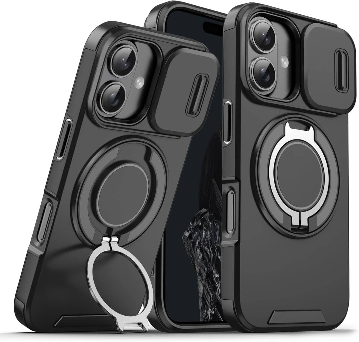 iPhone16 Plus ケース カバー 二重保護 カメラの保護 落下防止 米軍MIL規格 耐衝撃 リングスタンド付き ブラック 黑