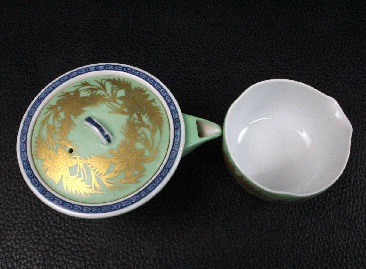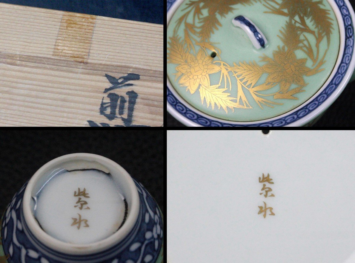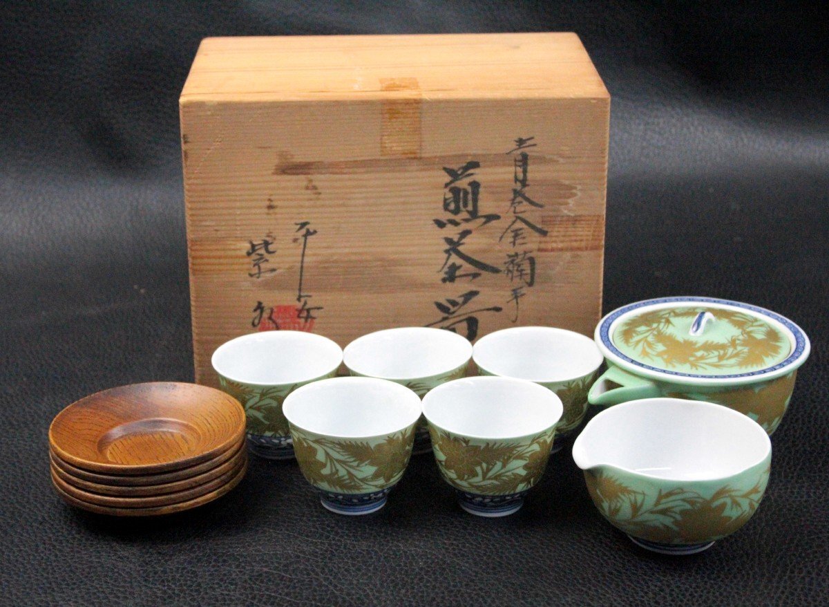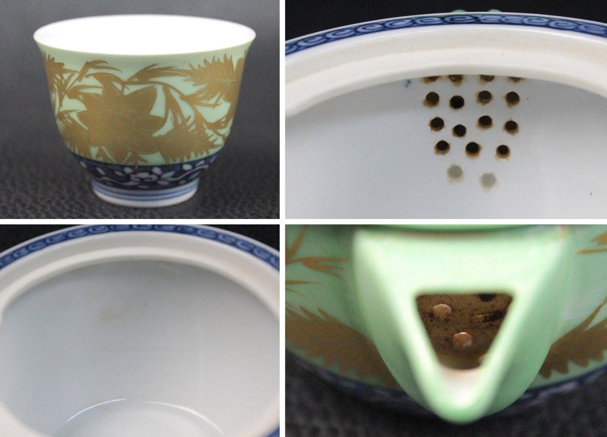 | ▼商品名 | 平安 紫水 青巻 煎茶器揃 金唐草 茶道 茶道具 茶器 伝統工芸 レトロ 骨董 アンティーク 共箱付き |