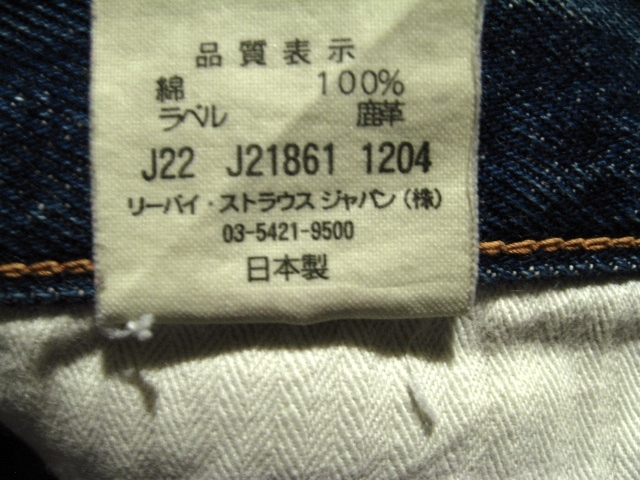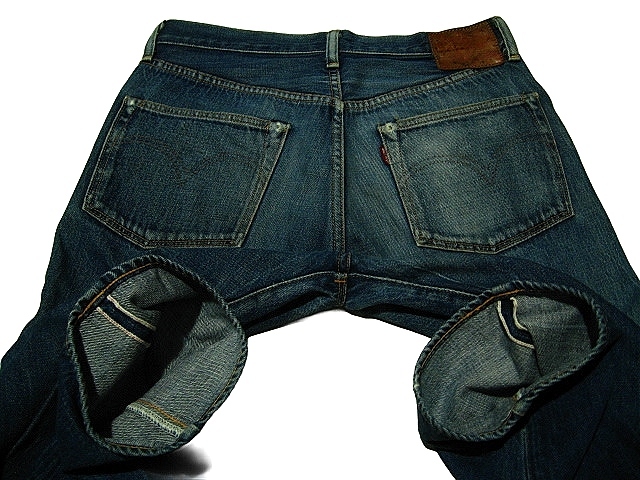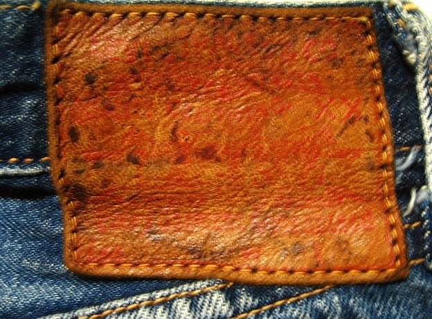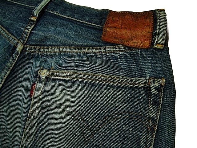 鹿革パッチ 、 赤ミミ 、 ビッグE 、 裾 = チェーンステッチ 、 隠しリベットあり、 ドーナツボタンフライ、 です。
