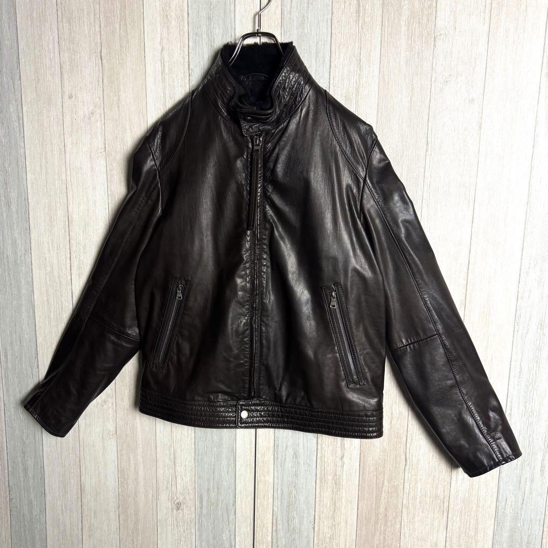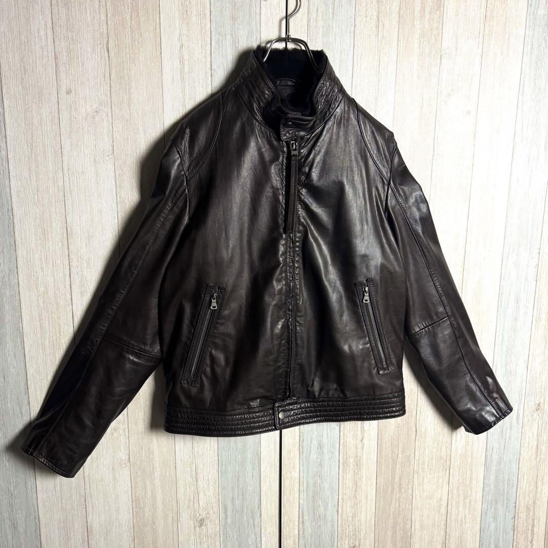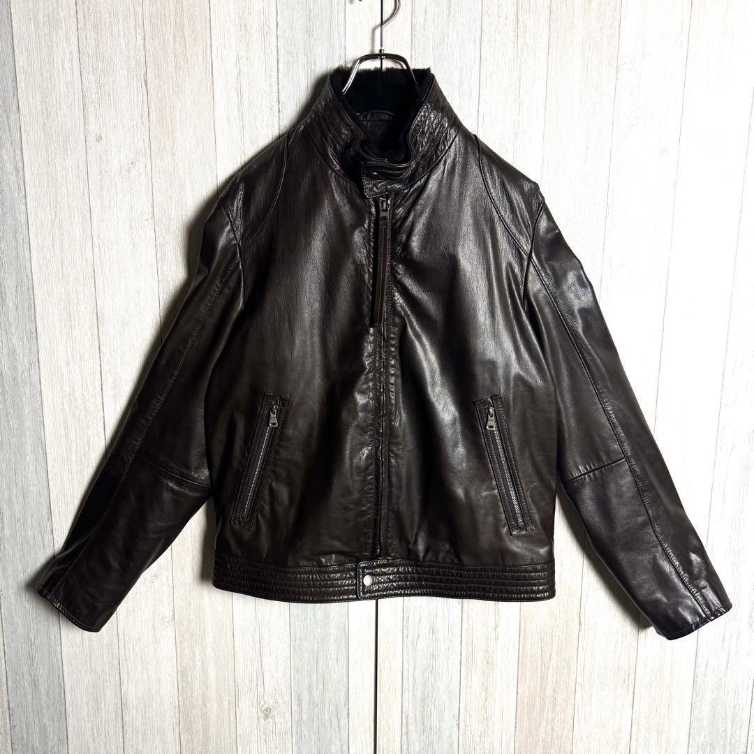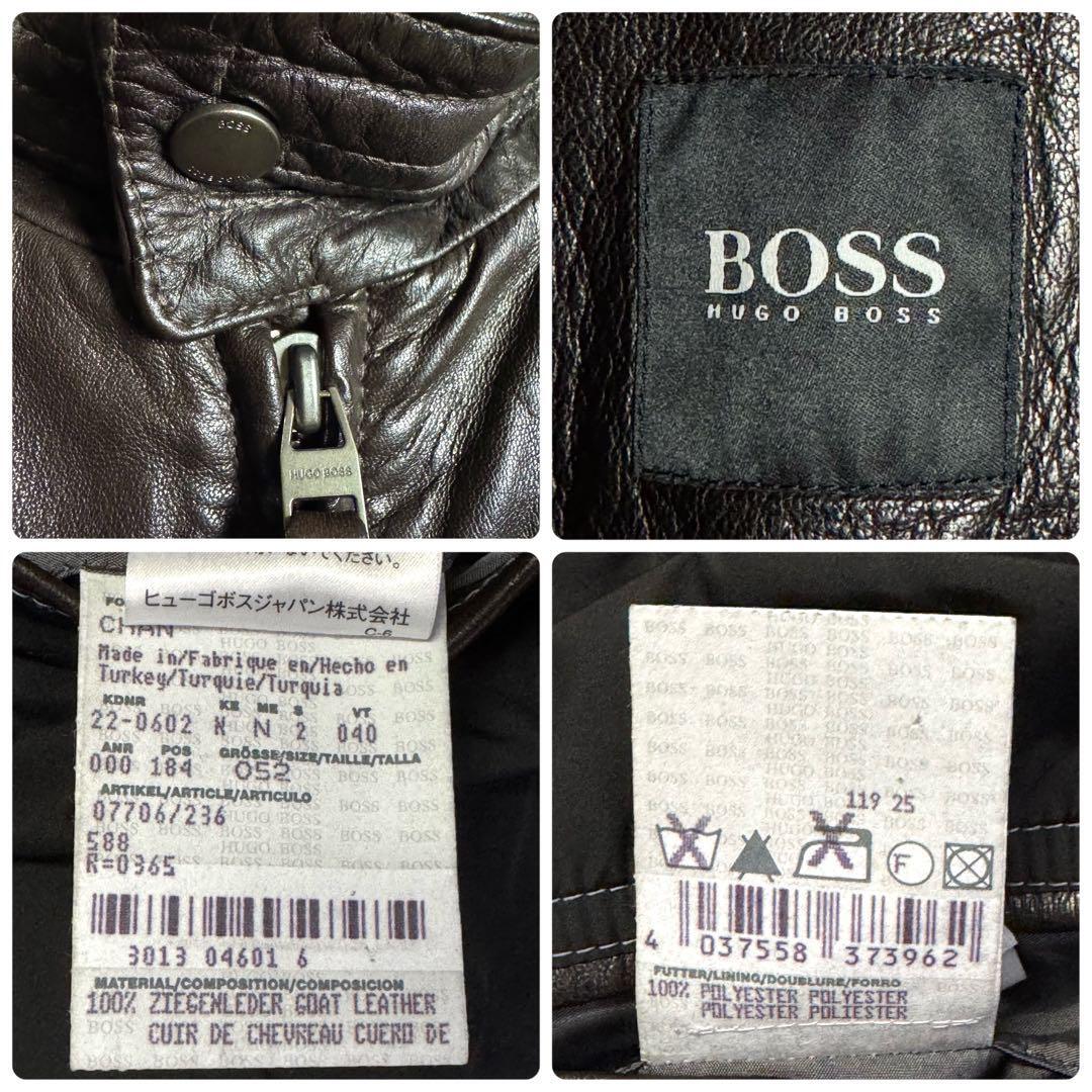 【希少ゴート素材・XL相当】HUGO BOSS ヒューゴボス ファー襟付 シングルライダースジャケット レザージャケット ダークブラウン 52