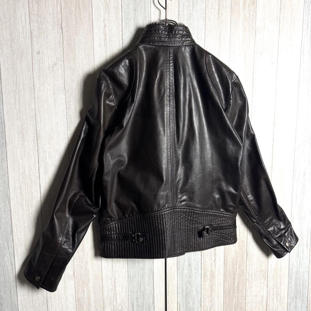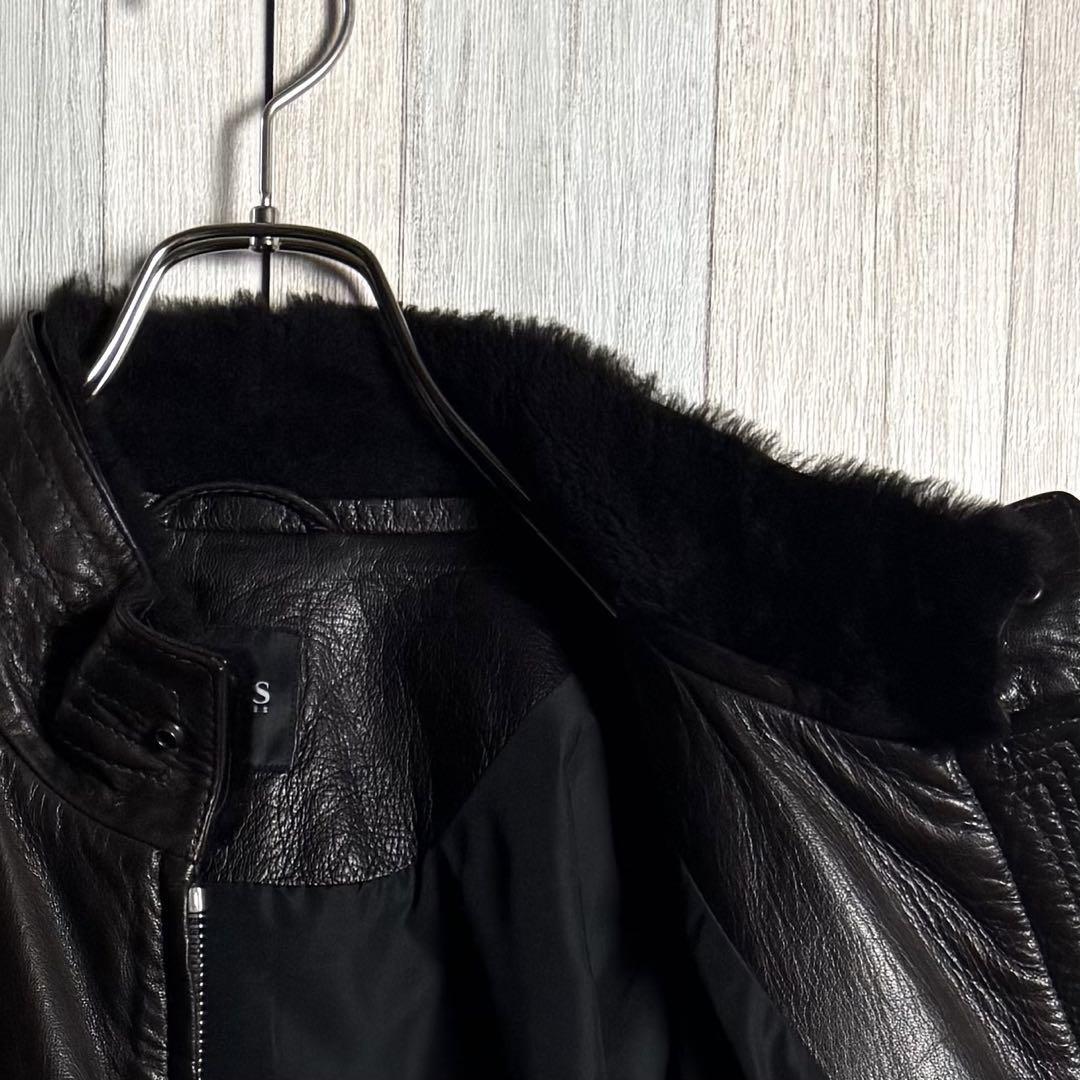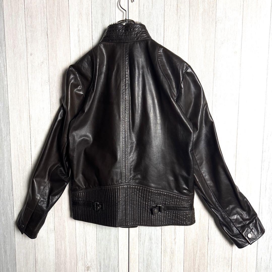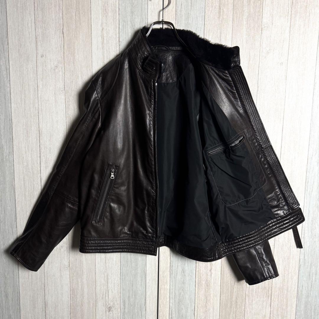 【希少ゴート素材・XL相当】HUGO BOSS ヒューゴボス ファー襟付 シングルライダースジャケット レザージャケット ダークブラウン 52