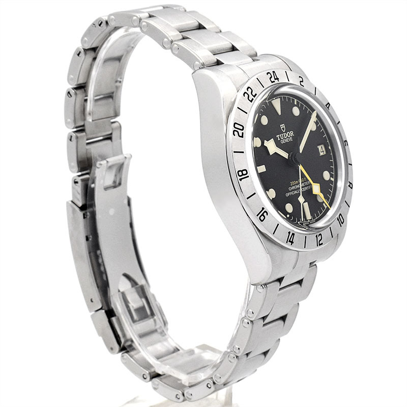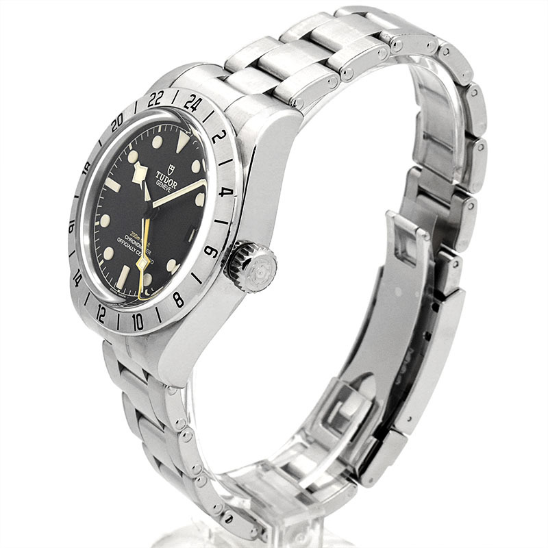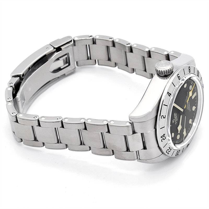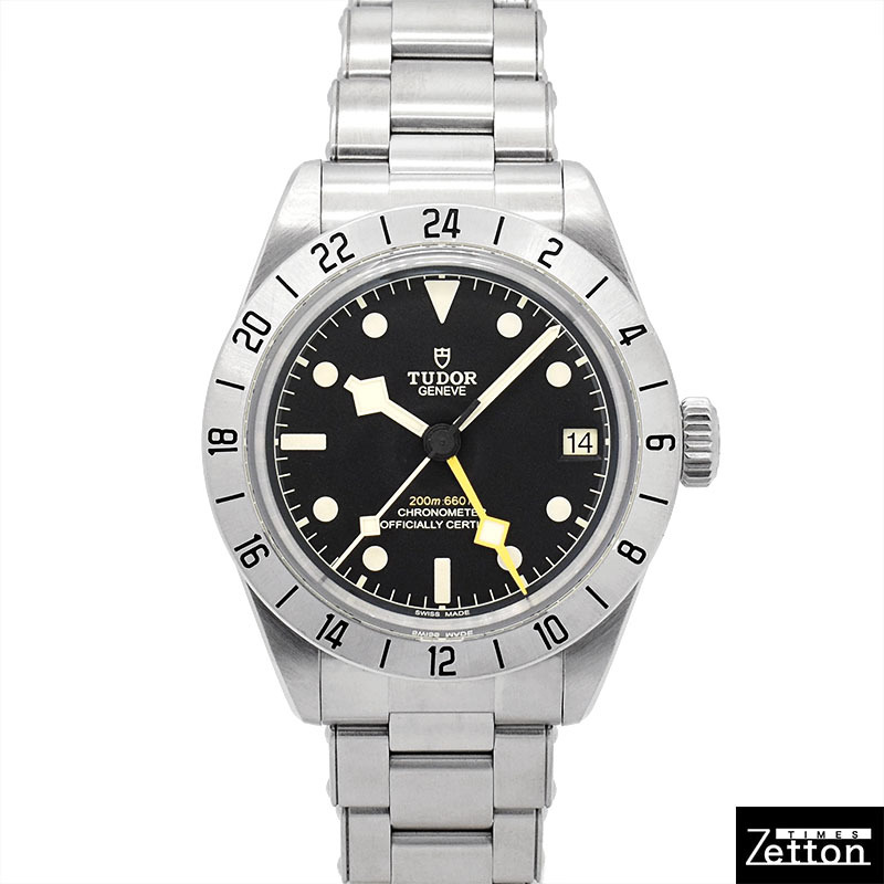 店長メモ | ブラックベイを象徴するイカサブ針を採用したヴィンテージ感溢れるデザインながら、ムーブメントには自社製キャリバー"MT5652"を搭載しGMT機能と日付表示を備えます。 |