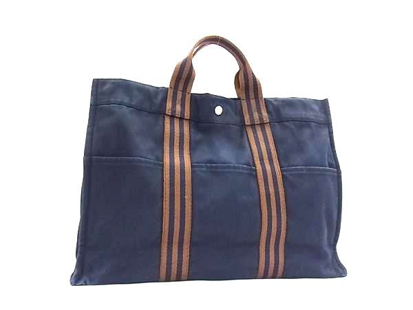 1円 HERMES エルメス フールトゥMM キャンバス シルバー金具 トート ハンドバッグ レディース メンズ ネイビー系×ブラウン系 BP4721