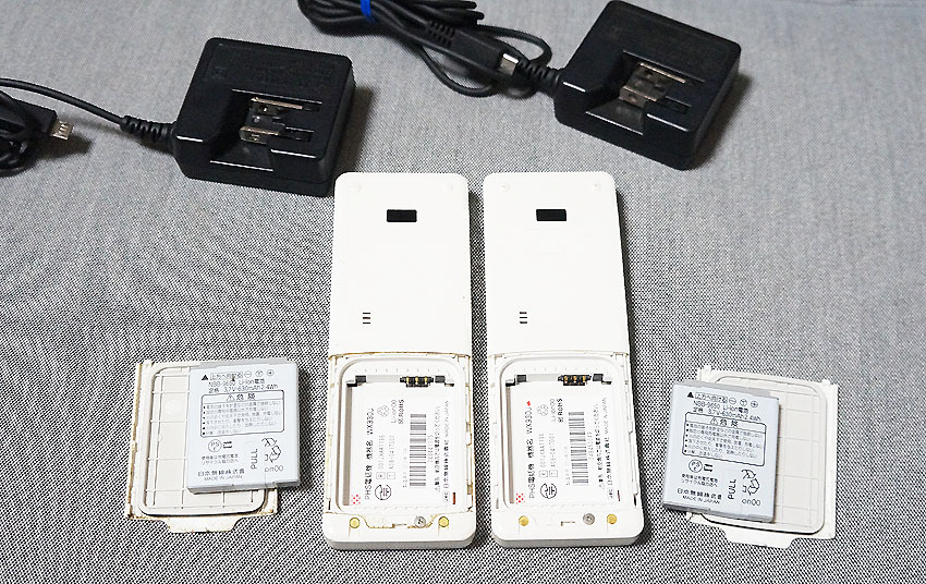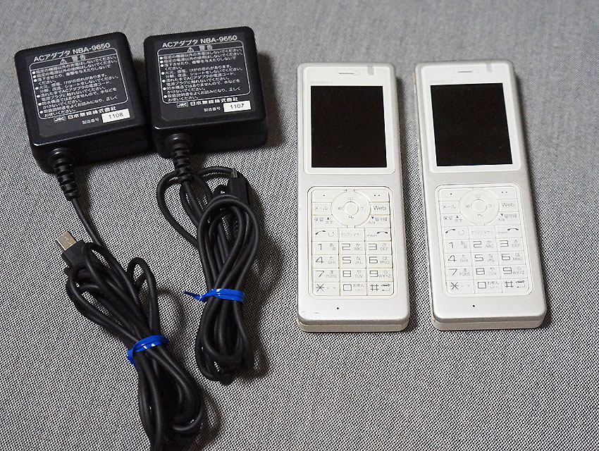 ☆2台セット、現状品です。 ●付属品:充電器×2(NBA-9650)/バッテリー×2 ・製造年:2010年10月/2010年7月 ・製造番号:248450049/248441175 簡単な操作、充電確認済み。 実際の通話等、細かい操作まで確認できません。 完全初期化済み。 暗証番号:0000 古い中古品につき、小傷やスレ、薄汚れあります。 細かい事を気になさる方はご遠慮ください。 現状品、ノークレームでお願いします。 | ||