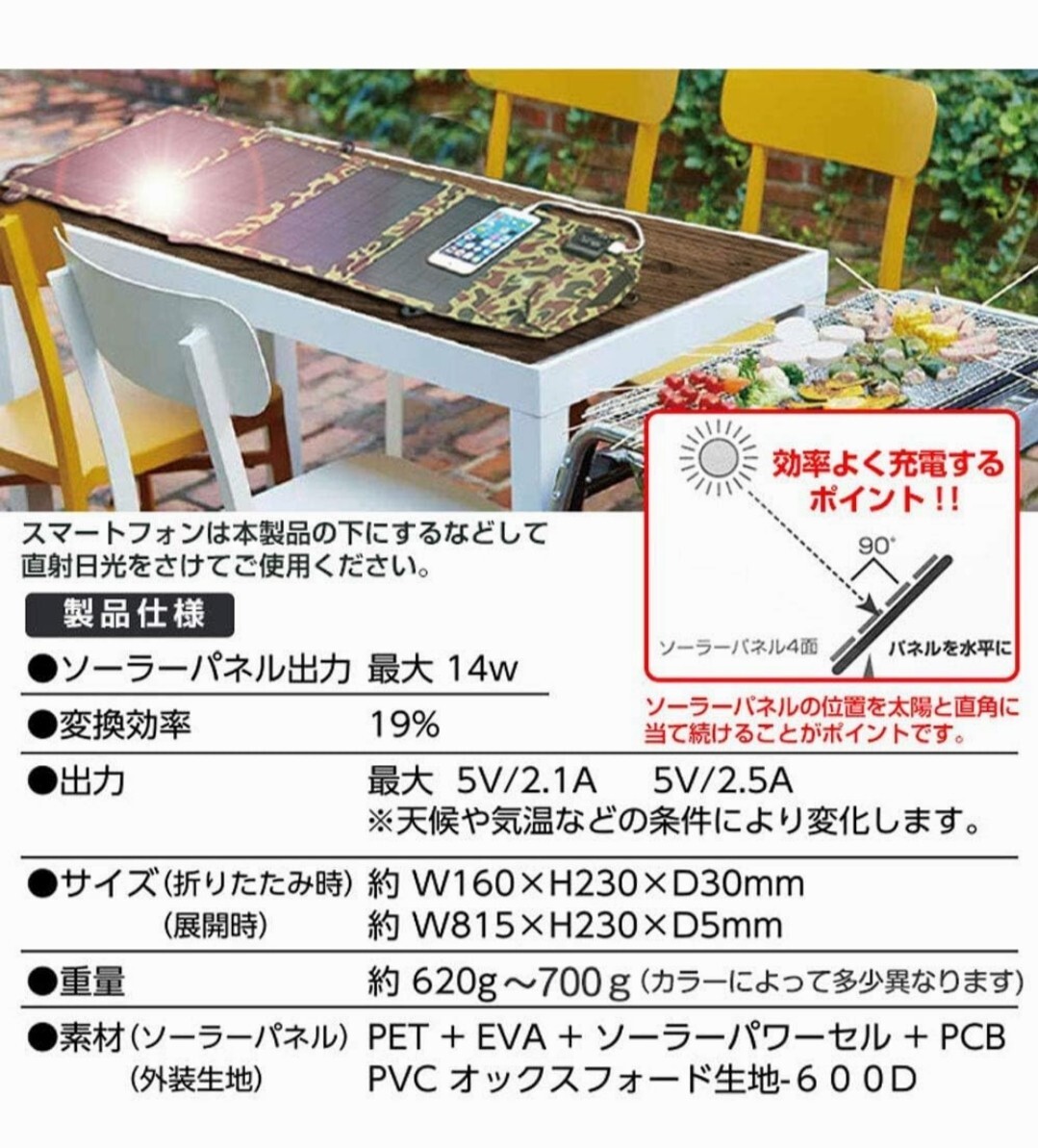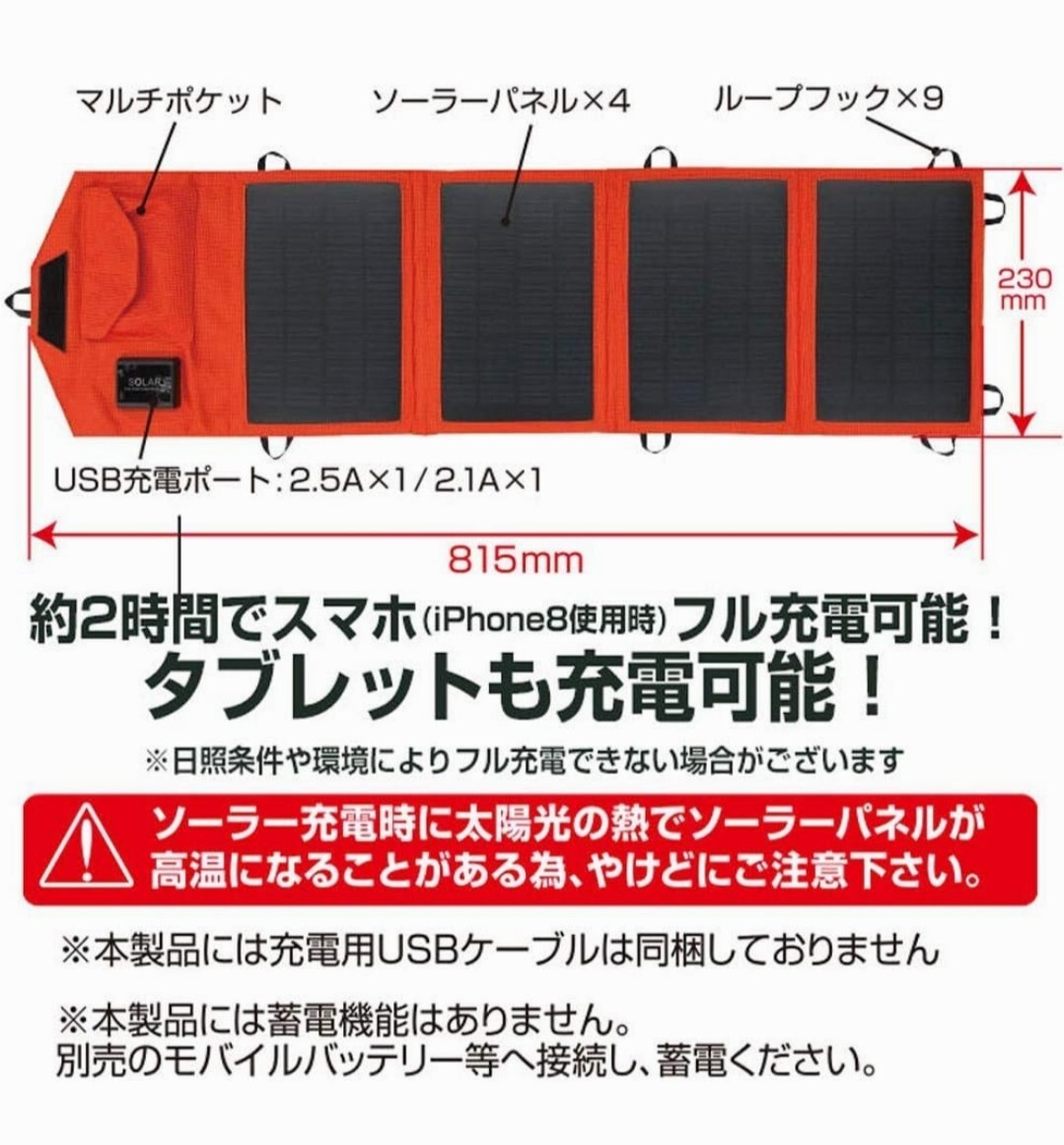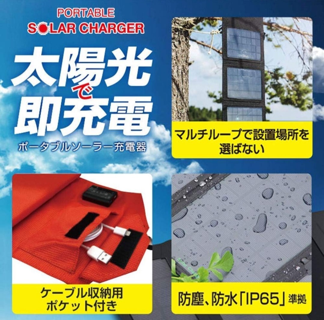 ■太陽光さえあればいつでもどこでも充電できる、2台同時接続可能なポータブルタイプのUSBポート2ヶ付きソーラー充電器です。