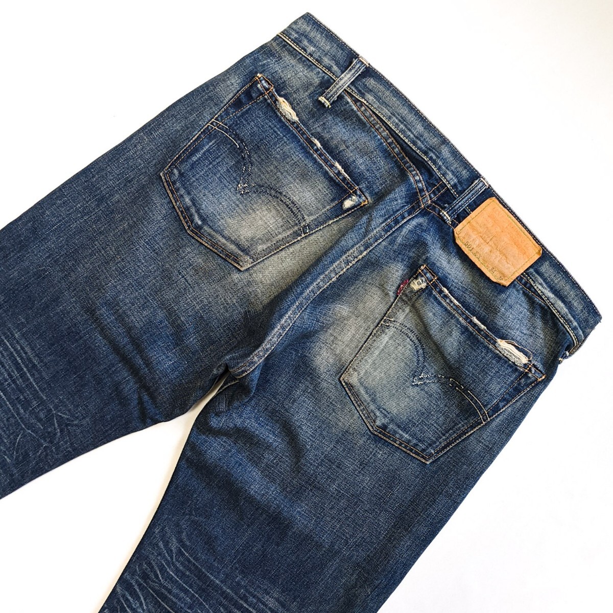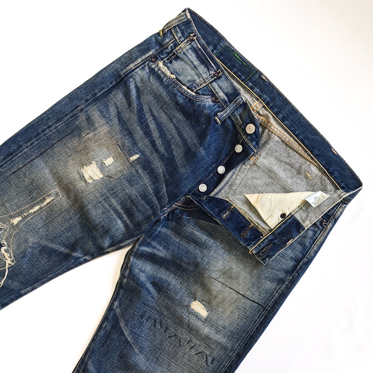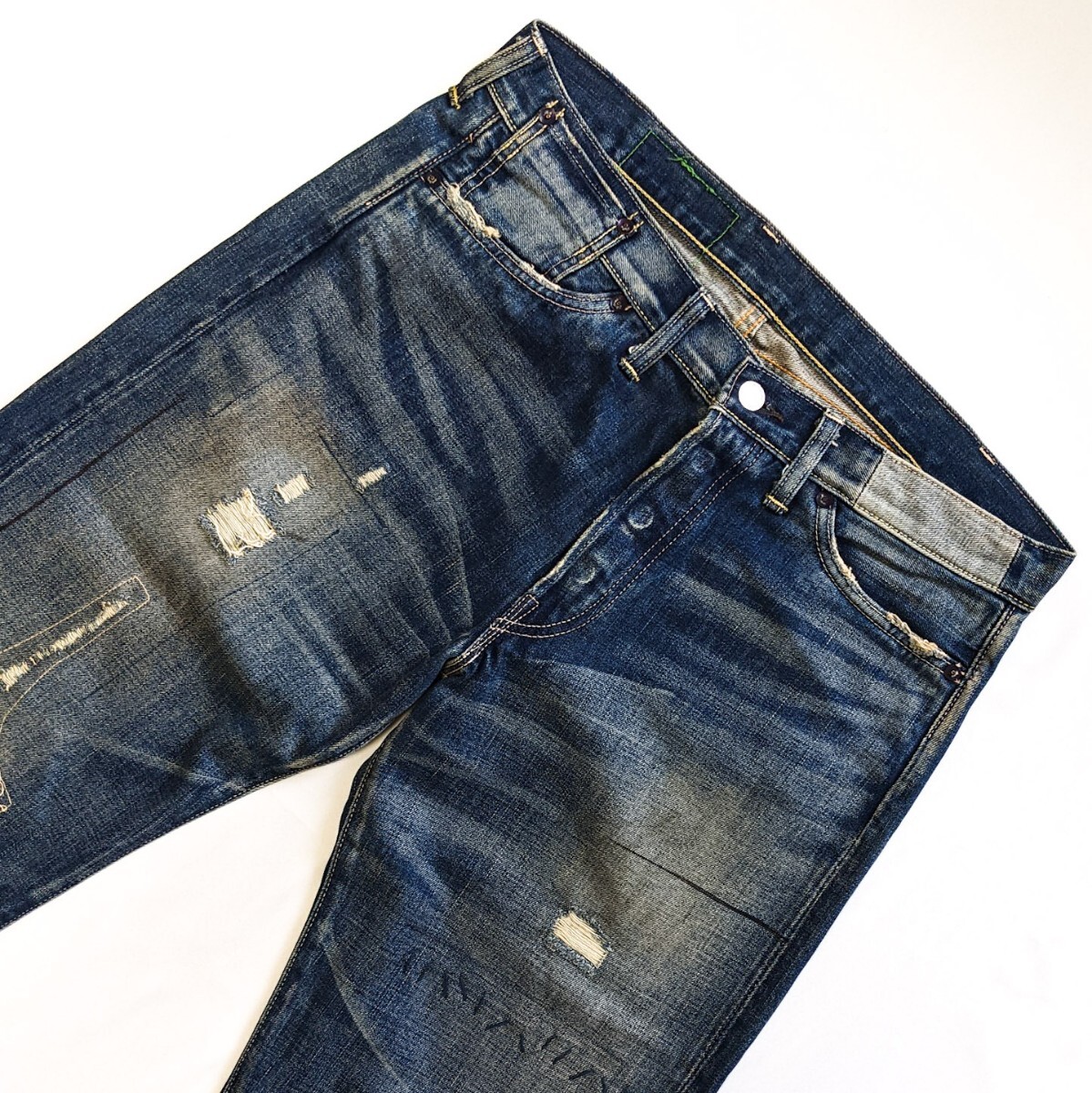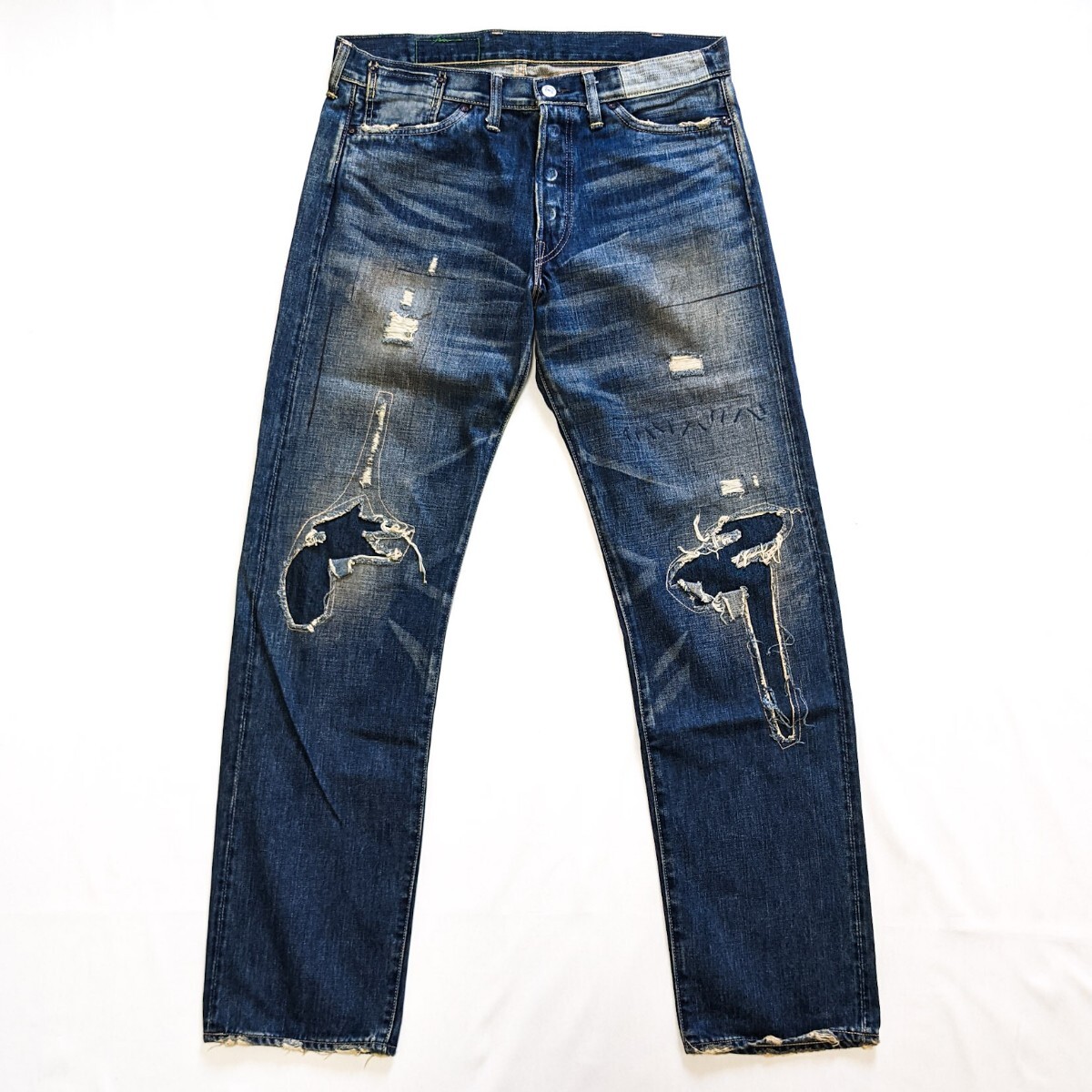 ヒゲ、タテ落ち、ハチノスなどのUSED加工やダメージ加工、そして全体的なリペア加工がカッコよく、雰囲気抜群のジーンズです。
