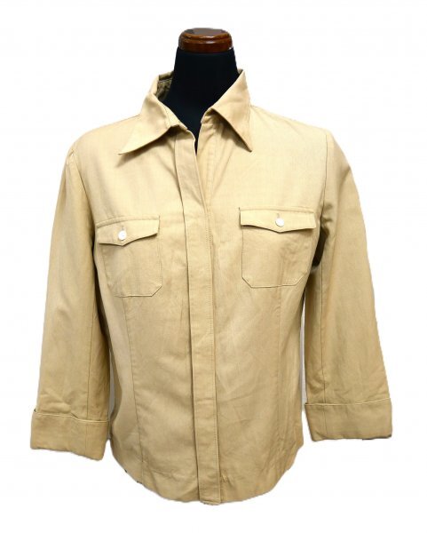素材は綿、レーヨンです。胸ポケット2か所ついています。右ひじに3㎜汚れがあります。袖口の糸がほつれ1か所補強しています。特に目立つ汚れはないと思います。三陽商会のものです。