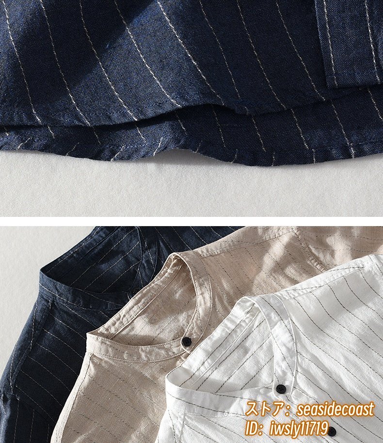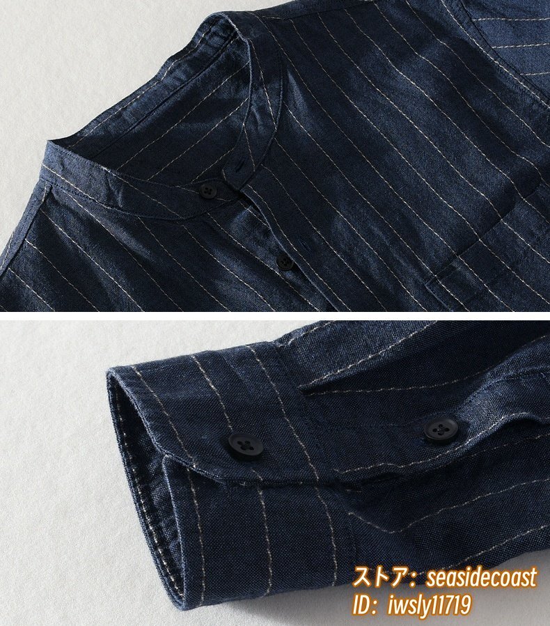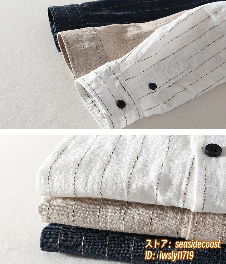メンズシャツ 長袖シャツ リネンシャツ 麻シャツ ストライプ柄 綿麻 春夏秋 新品 サマー 心地良し カジュアル スリム 清涼感 ネイビー 3XL