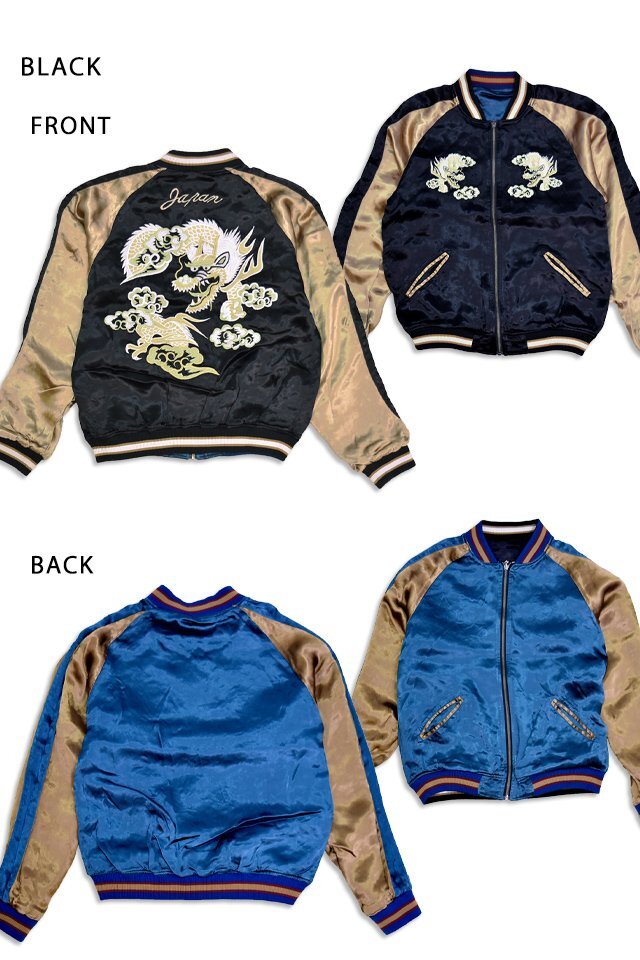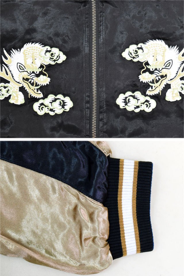 絡繰魂さんから【ZIPANG LUXE】ALL振り刺繍オーバーダイ加工リバーシブルスカジャン「雲龍」(253020)のご紹介です。 絡繰魂の新ライン【ZIPANG LUXE】が誕生しました! 振り刺繍という、針が左右に動く横振りミシンを使って、職人が直接生地に柄を刺繍する技法で製作された、こだわりのスカジャンとなっております。 ボディーには、製品を作った後に染色する「オーバーダイ加工」を採用。 均一に染まらず独特な色味や風合いをお楽しみ頂くことが出来ます。 今回、モチーフの主役に採用されたのは【雲龍】柄。 背中には、レトロなタッチで描かれた雲龍をダイナミックに落とし込みました。 表面はしっかり柄の入ったスカジャンですが、対象的に裏面はシンプルに仕上げ、メリハリを付けました。 ボディーにはレーヨンサテンを使用し、ドレープや陰影がくっきりと現れています。 1枚持っているだけでずっと使えるスカジャン。 | ||||||||||||||||||||