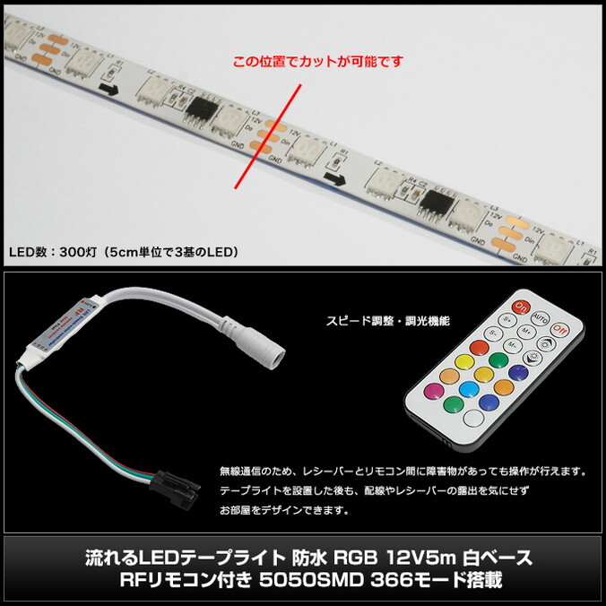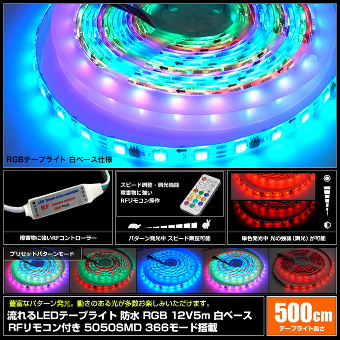 | 流れるLEDテープライト 防水 RGB 12V 5m 白ベース RFリモコン付き 5050SMD 366モード搭載 | 1個 |