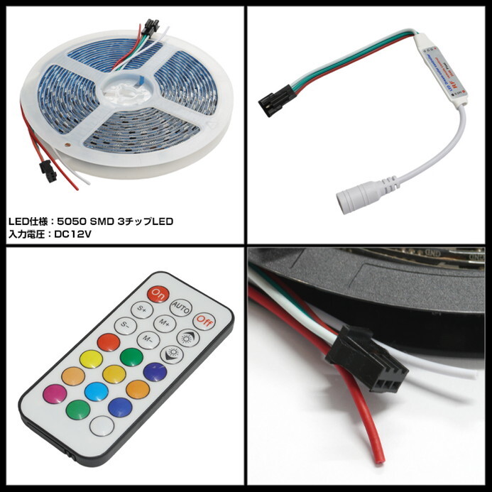 | LED仕様:5050 SMD 3チップLED 入力電圧:DC12V 入力端子:5.5-2.1mm 基板色:白ベース 発光色:RGB (赤/緑/青) 消費電力:約26.64W 電流値:約2.22A(実測値) LED数:300灯(5cm単位で3基のLED) 防水加工:テープライト本体のみ(コントローラーは非防水) カットライン:約5cmごとにカットが可能 リモコンひとつで色、明るさ、動き、スピードを変更できます。 366モードの点灯パターンが登録されているのでワンタッチで切り替えが可能です。 テープライトの末端には延長用のコネクタが付いております。 ご使用の際は同商品を延長接続し、12V電源のプラス側(+)を赤、マイナス側(-)を白に接続して下さい。 | |