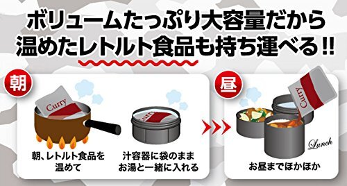 説明 汁容器容量アップ400ml(当社従来品比較 ボリュームたっぷり大容量だから温めたレトルト食品も持ち運べる ご飯容器(1杯約200ml)×約4杯分 内容器は、ふたを外して電子レンジOK 保温・保冷可能なランチジャー