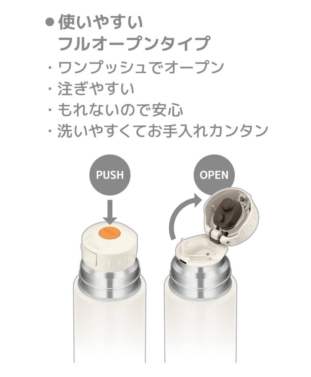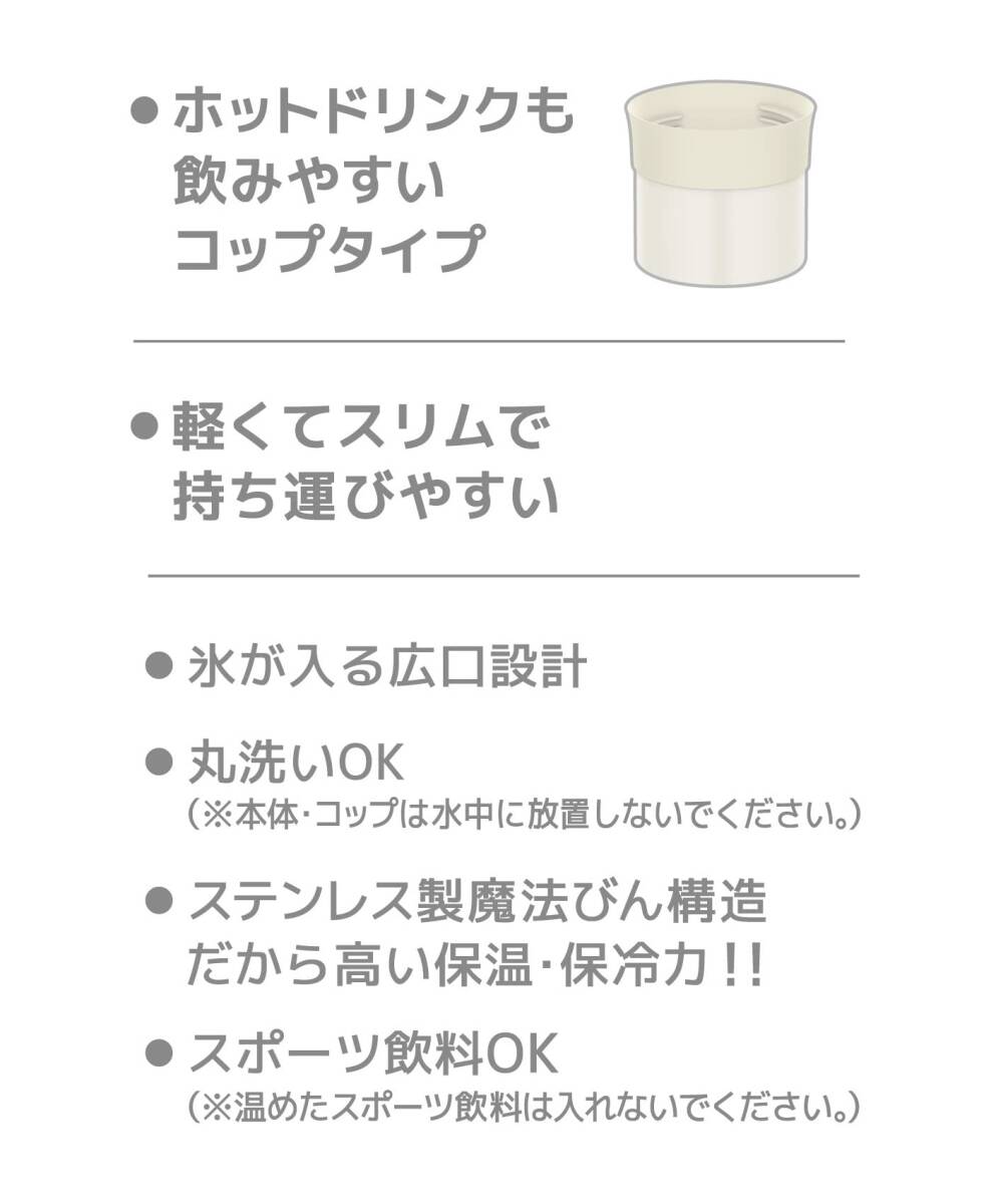 ●パーソナルからファミリーまで、お子様から年配の方まで用途や世代・性別を選ばず、さまざまなシーンに活躍するステンレスボトル ●スタンダードだけど、使いやすさ、お手入れのしやすさなどを重視したステンレスボトル ●魔法びん構造だから、高い保温・保冷力 ●おでかけにも便利なコップ付きタイプ ●軽くてスリムで持ち運びやすい ●使いやすいフルオープン中せん。注ぎやすい