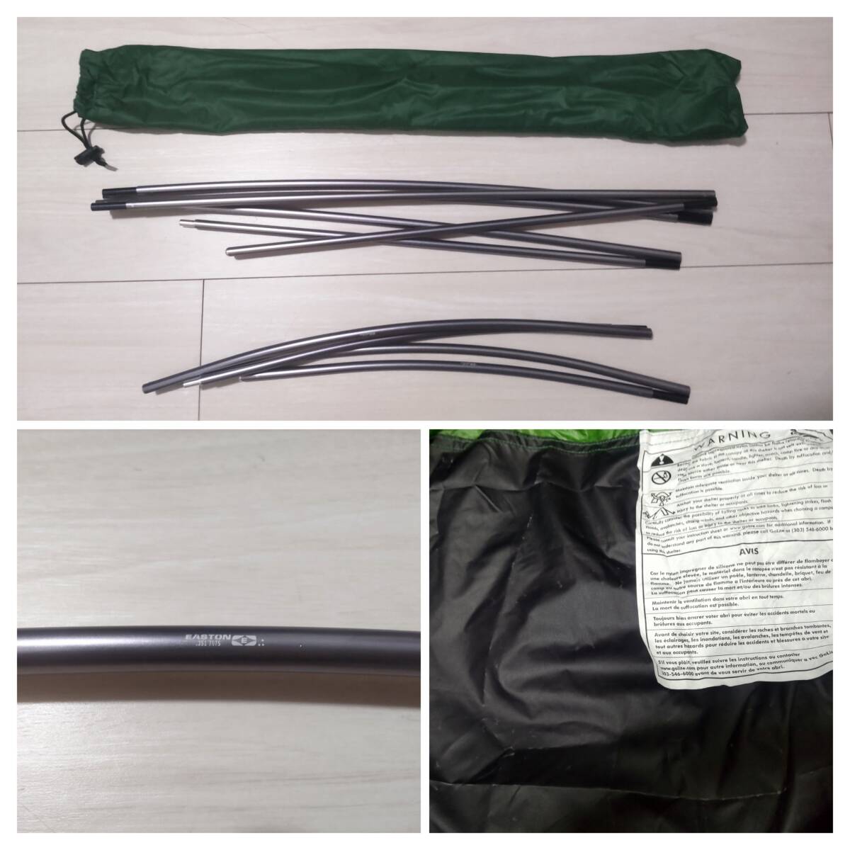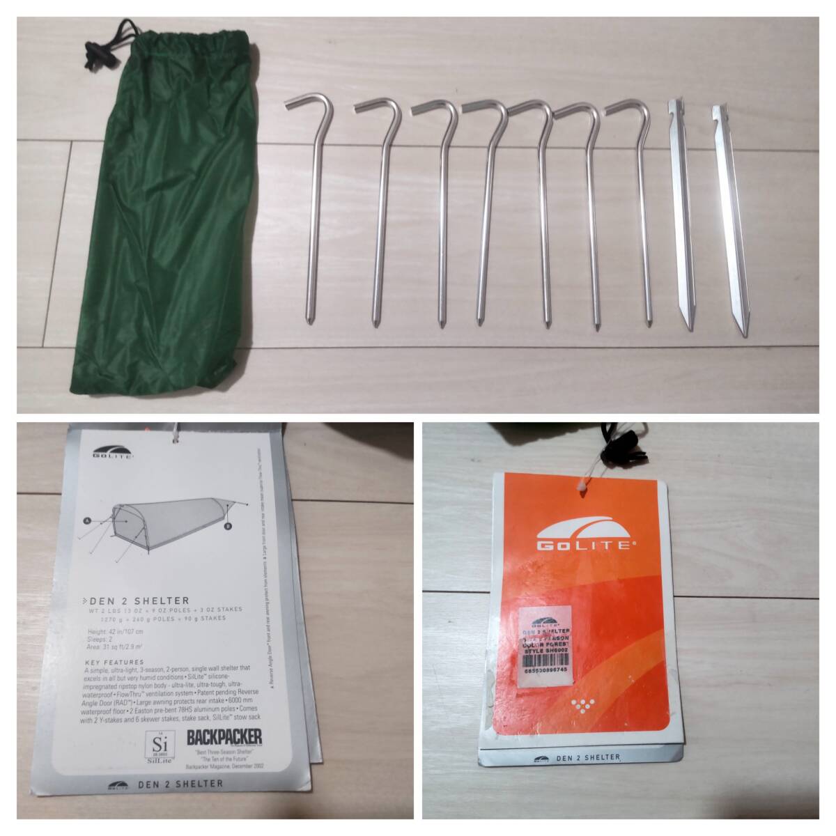 アメリカ、GOLITE(ゴーライト)社のテントです 軽量にこだわったアウトドアブランドです 現在は消滅しているブランドですので貴重だと思います ■モデル名はDEN2です オールドモデルになります ■未使用品になります 購入後そのまま保管しておりました 黒色のフロア部内側に少々のダメージ(一部は写真8枚目向かって右下をご参照下さい)と若干のべたつきがありますがご使用に特に問題はないと思います その他はよいコンディションだと思います タグは付いておりますがダメージがあります ■2人用です ■3シーズン用です シングルウォールとなります ■本体はリップストップナイロン製です SilLiteを使用しておりシリコン加工がされております ■サイズは表記より 面積は2.9m2 高さは107cm とあります またテント本体とポールとペグの総重量は約1620gとあります ■パッキングサイズはおおよそとなりますが 約55cmX13cmX11cm程です ■色は緑です ゴーライトらしいカラーです ■内容はテント本体、ポール2本、ペグ2種類計9本、スタッフサック、ポールケース、ペグケース、説明書(英語)です ■ポールはEASTON(イーストン)社のものを使用しております ■入口側とボトム側の面はメッシュ地が付いております ベンチレーション機能があります 天気によって使い分けることが出来ます ■完成はイメージとなりますが写真3枚目のような感じになります(また色が少し違います)■ファンの方いかがでしょうか 是非よろしくお願致します