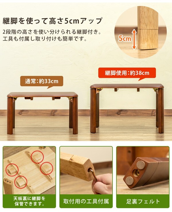 | サイズ | (W)幅60cm×(D)奥行き45cm×(H)高さ33/38cm 天板の厚み:約1.8cm 折りたたみ時の厚み:約7.8cm |