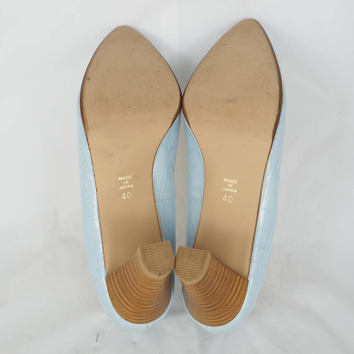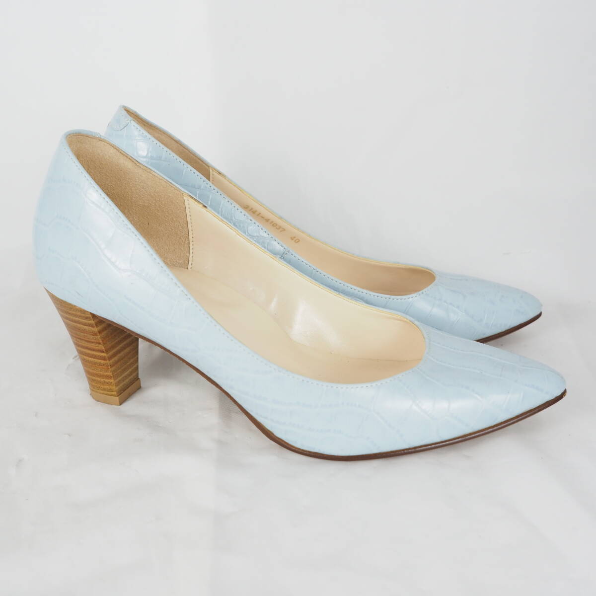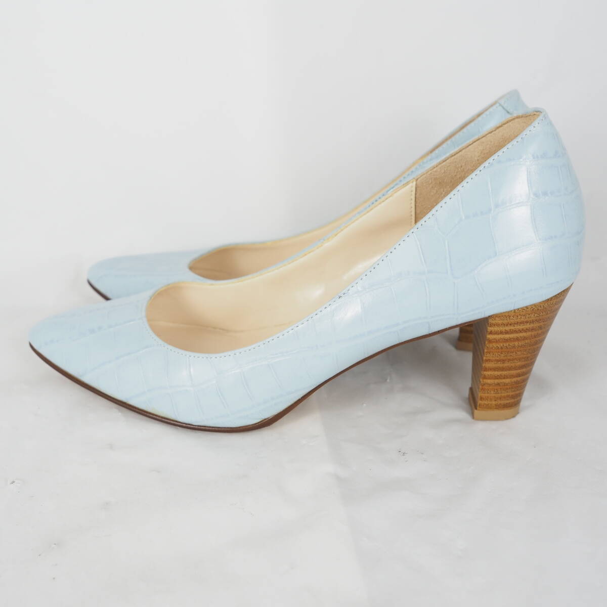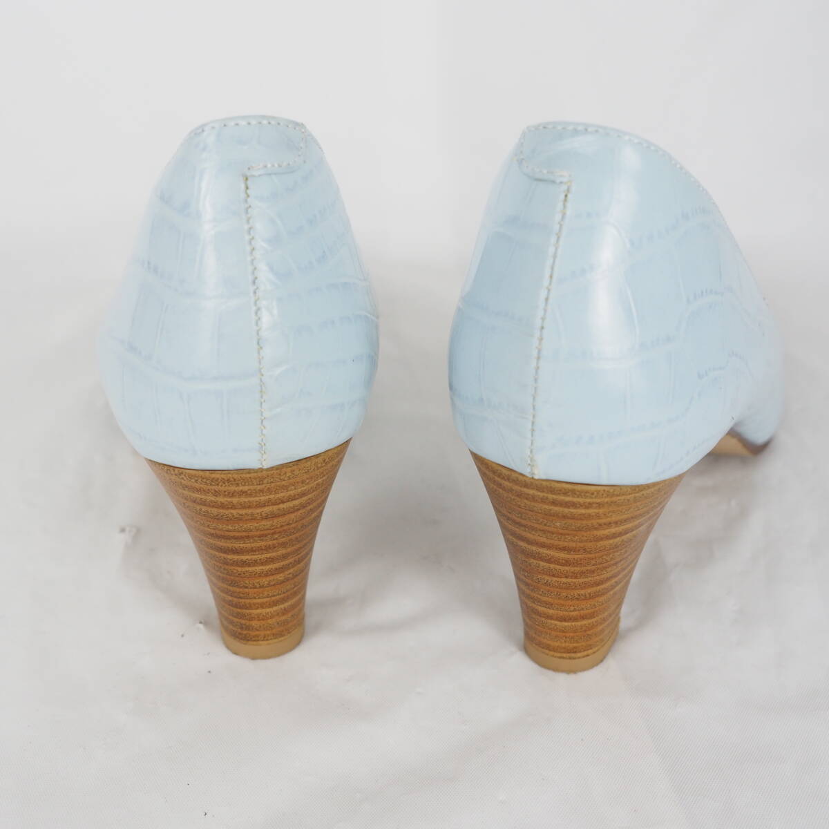ページをご覧いただきありがとうございます^^靴、ブーツを中心に出品しております。 爽やかなライトブルーにクロコ風型押しが施された、洗練された印象のパンプス 程よい高さのウッド調ヒールで、カジュアルにもフォーマルにも合わせやすい一足です。 ☆商品詳細☆