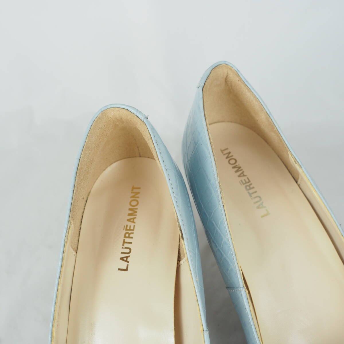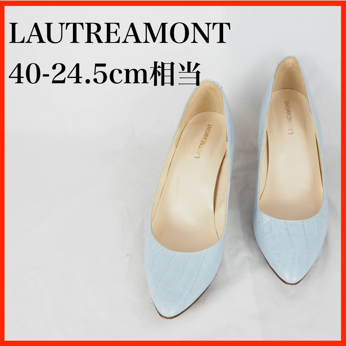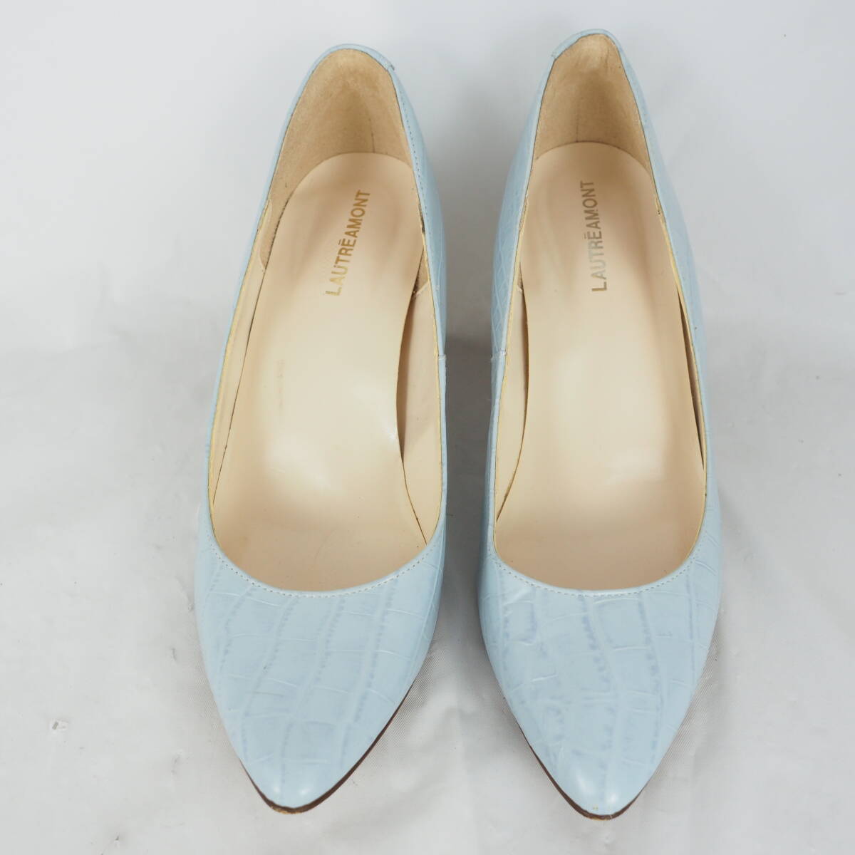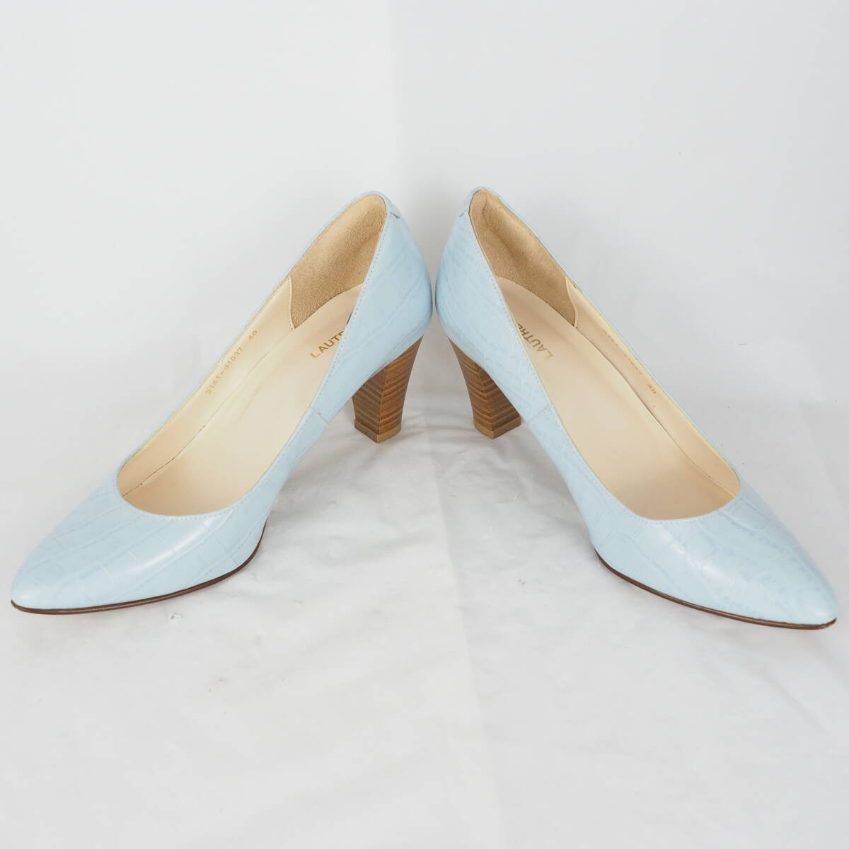 ページをご覧いただきありがとうございます^^靴、ブーツを中心に出品しております。 爽やかなライトブルーにクロコ風型押しが施された、洗練された印象のパンプス 程よい高さのウッド調ヒールで、カジュアルにもフォーマルにも合わせやすい一足です。 ☆商品詳細☆