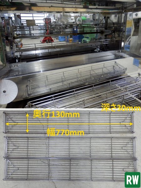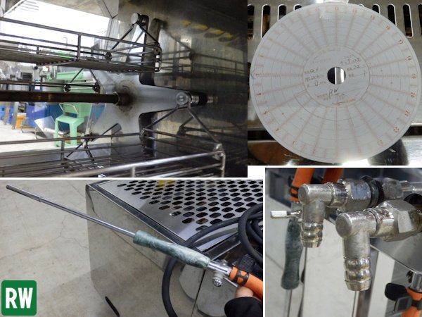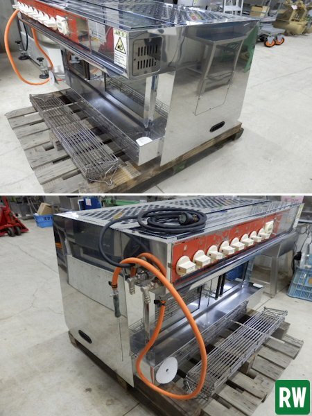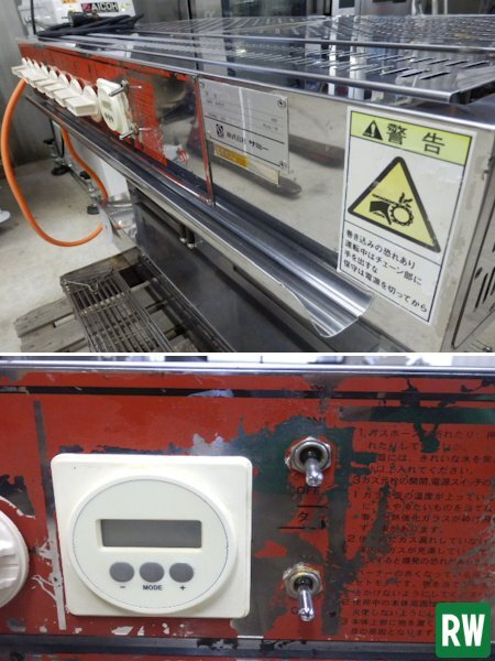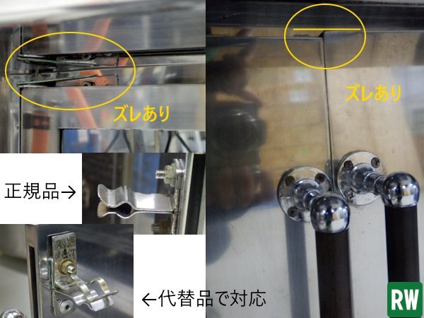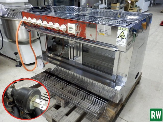 | 状態 | 中古品 汚れ、傷、スレ、サビ等ございます。正面(お客様側)と背面(調理者側)はガラスです。 バーナーに傷みがありますので、気になる方は交換しご使用下さい。 前扉に傾きあり。扉内側の留め具は片方ありませんでしたので、代替品を付けております(画像6) 予備のゴンドラが3点付属します。 | ||||||||||