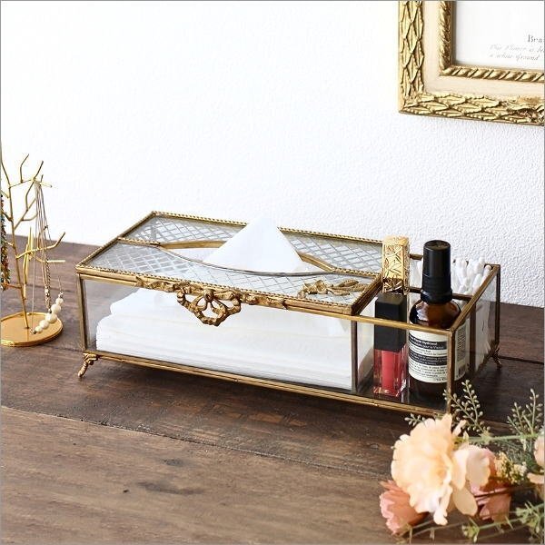 こちらのページでは【Aカラー】のみの販売です 真鍮のフレームとガラスの透明感が織りなす クラシックデザインのティッシュボックスは 収納スペースが付いていて メガネ、リモコン、メイクブラシなども一緒に スッキリとまとめて収納できます 天面ガラスには斜め格子のカッティングと エレガントな真鍮の装飾が施され 日常の必需品を まるでインテリアオブジェのように 演出してくれます 使用例 ・リビングのテーブル上で ・デスク周りで ・ドレッサーやパウダールームで ・サロンやホテルの受付で 商品名 : 真鍮とガラスの小物入れ付きティッシュケース 商品番号 : vin5105 全体サイズ(cm) : 幅30.5×奥行13×高さ9.5 内寸 : 大)幅21.8×奥行12×深さ6.5 小)幅6.7×奥行5.8×深さ6.5 ティッシュ取り出し口 : 幅14.5×奥行5 材質 : 真鍮 ガラス 重量 : 1.15kg 生産国 : インド ※商品の特性上、わずかなガタつきや傾き、隙間、ガラスの小傷、汚れ等はご容赦ください ※真鍮の特徴である、空気中の成分と反応して起こる色のムラ・黒ずみ(経年変化)が見られます。素材の特性と風合いをお楽しみください ※ディスプレイによる色の違いはご了承下さい |