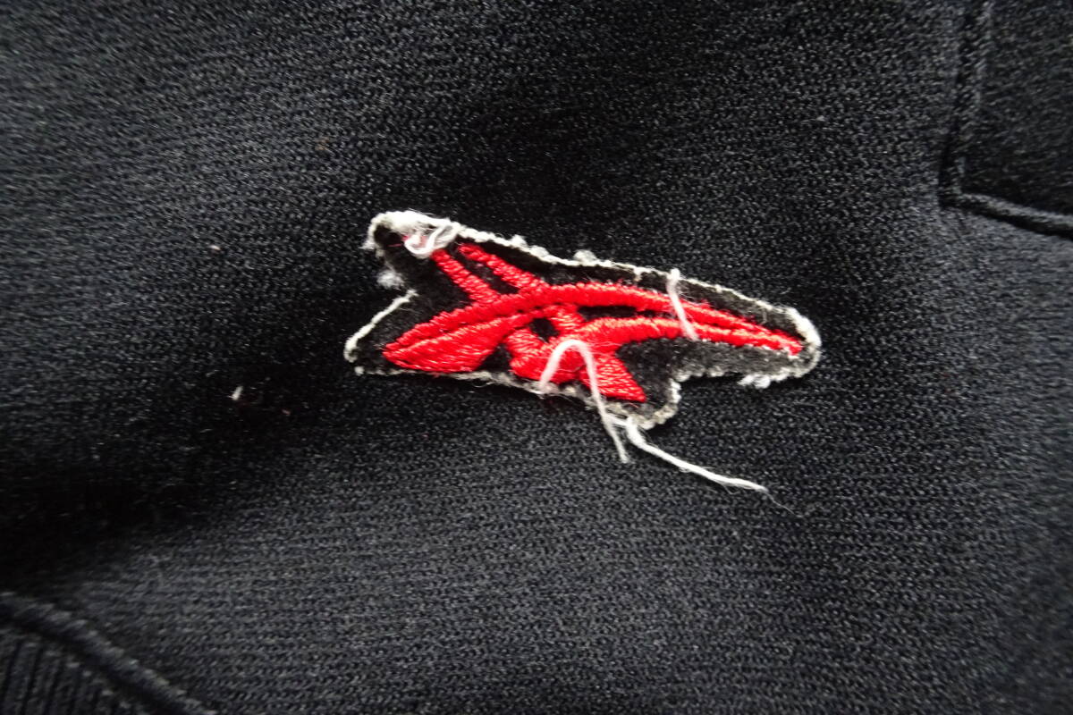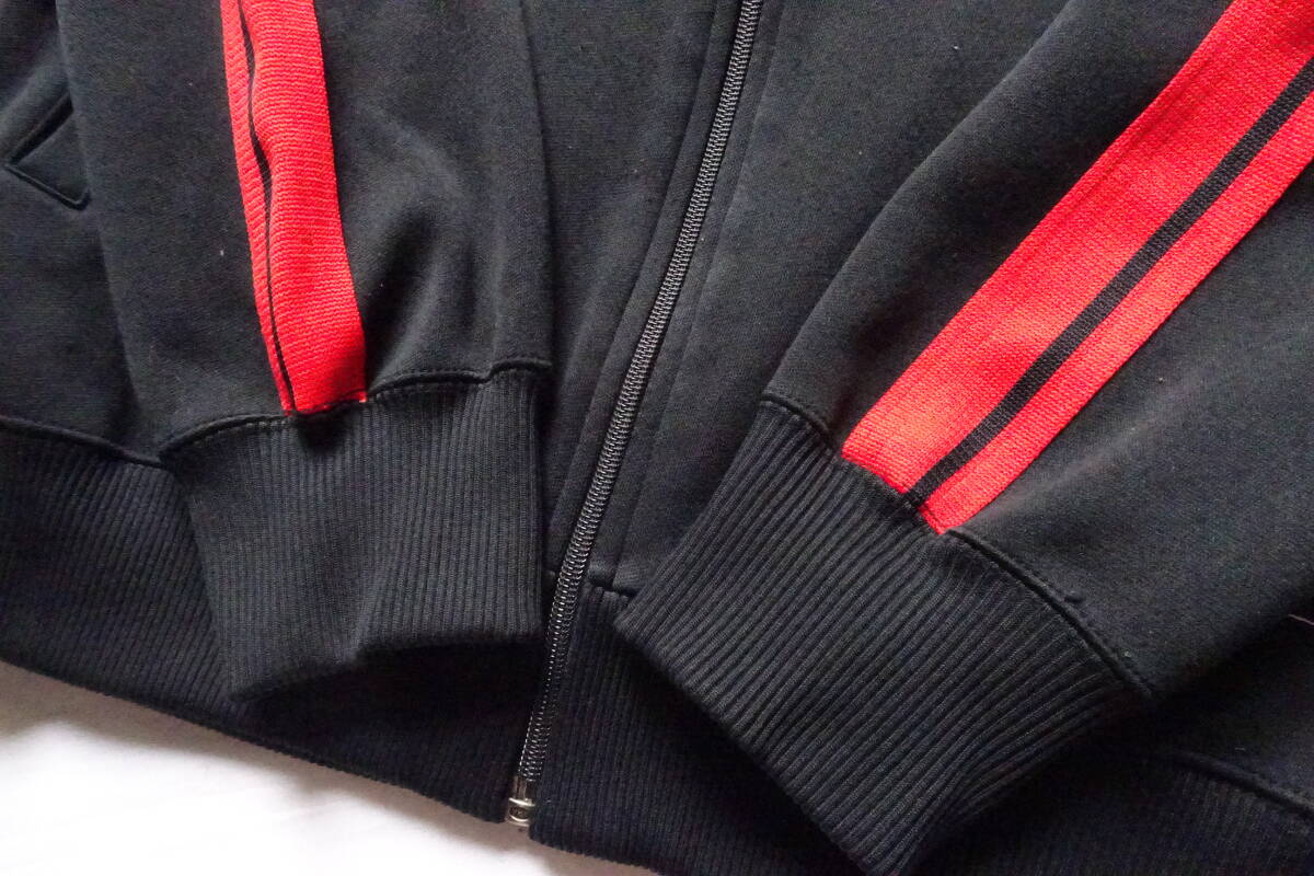 肩から袖にかけて、赤、黒ラインテープ生地切り替えです。