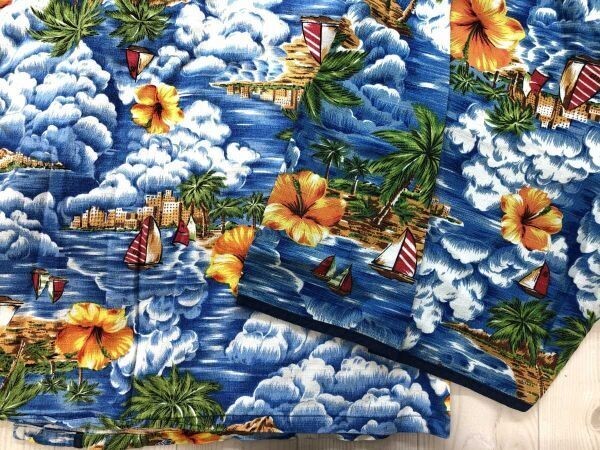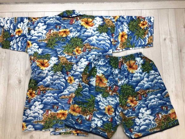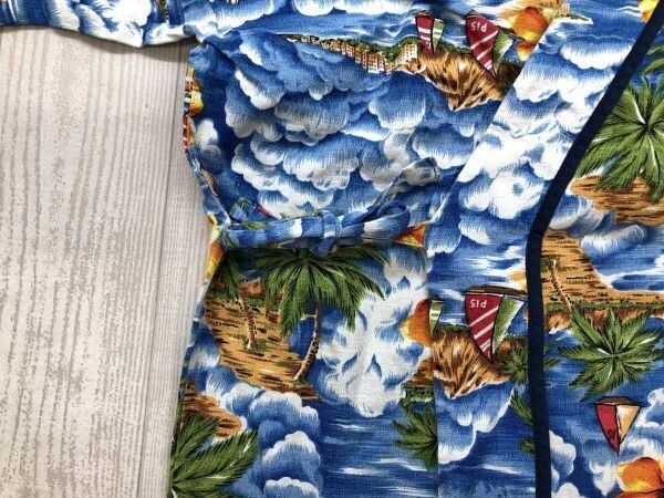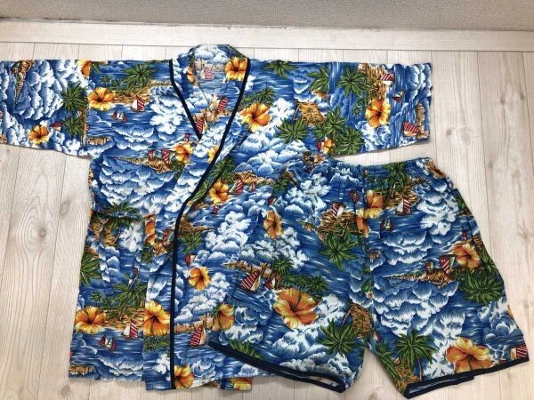 オールド サーフ リゾート ハイビスカス ヤシの木 ビーチ アロハプリント 総柄 甚平上下セットアップ メンズ 身頃ポケット付き 青 です。