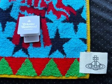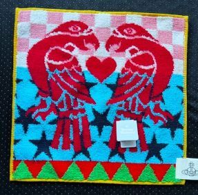●タグシールも付いたままの、未使用、新品のヴィヴィアン ウエストウッドの市松・星・鱗柄地にオウム柄タオルハンカチです