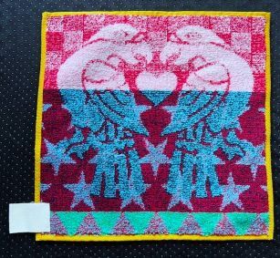 ●ピンク色×白色の市松柄・水色×紺色の星柄・赤色×グリーン色の鱗柄の上にオウムとハートが赤色で編み込まれたタオルハンカチです