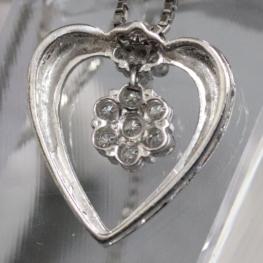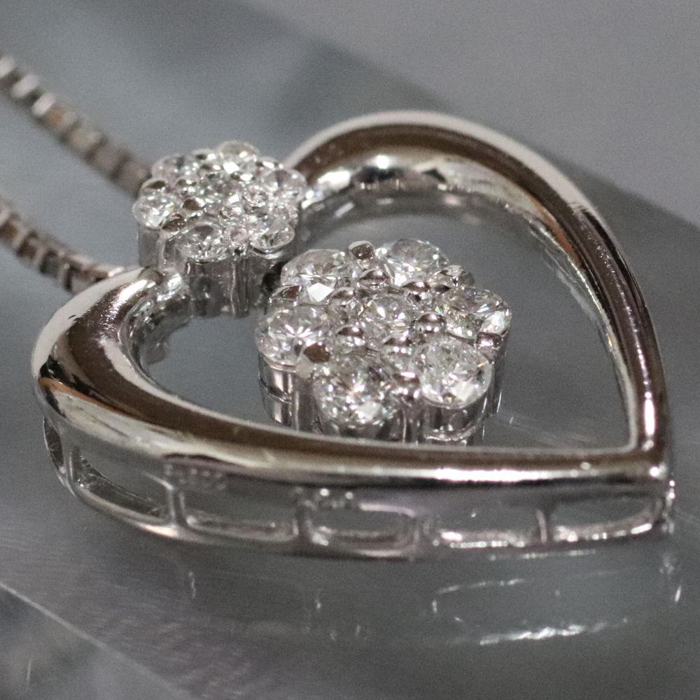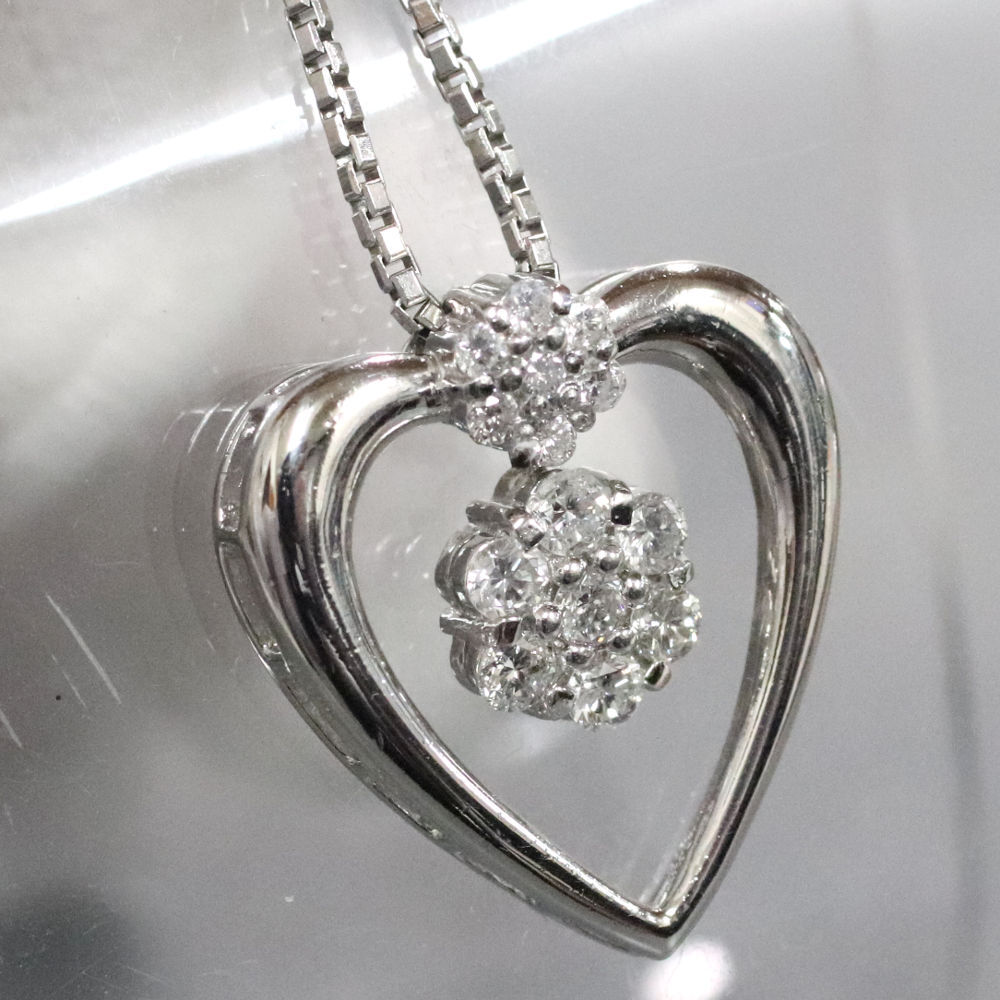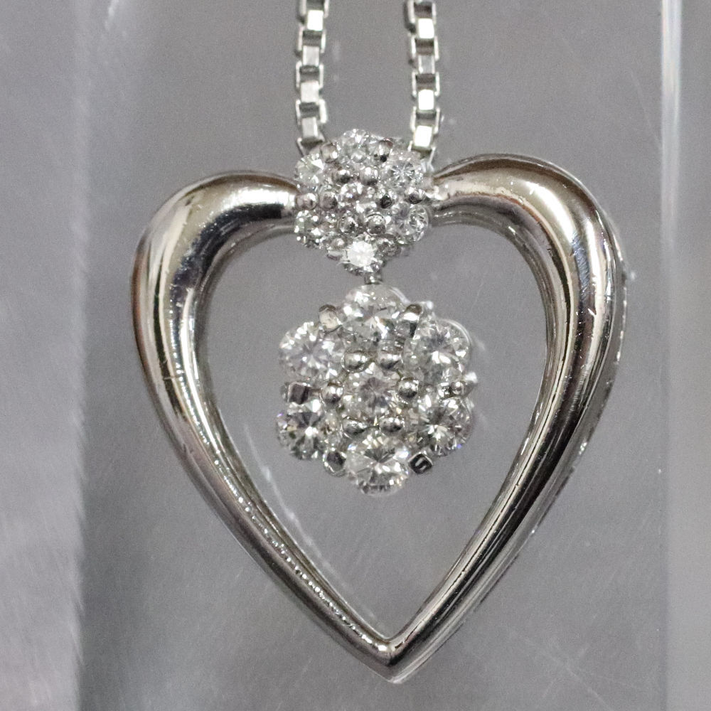 Pt900/850ダイヤモンドペンダントの中古品です。 ハートの可愛らしいペンダントです。 ダイヤモンドはインクルージョンが多くあります。 プラチナに使用による細かな傷があります。