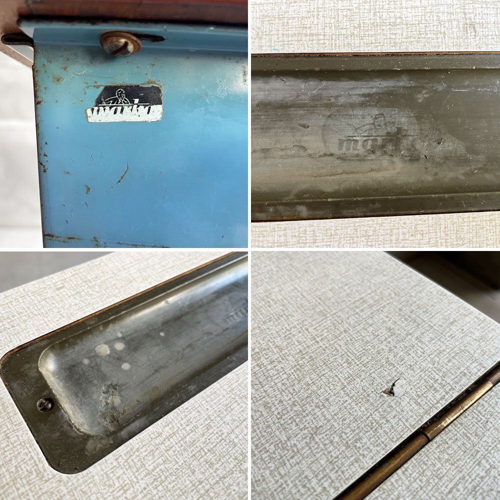 | コメント | 1945年に2兄弟が乳製品工場を改築し設立した"マルコ Marko"社。当時は自転車ペダルを製造していましたが、1950年初頭から家具や学校製品も製造し始めました。 2014年にEromes社と合併し、現在はeromesmarko社として多くの学校製品を手掛けています。 今回はそんな"マルコ Marko"から、ビンテージのスクールデスクが入荷致しました。 小学生ぐらいが使ってたであろう小振りなサイズ感。実用でもオブジェとしてもおすすめなアイテムです。 天板にはスライド式のインク瓶収納が付いており、万年筆やインクで絵を描く方にもオススメです。 また、天板は開閉式になっており、机内に書類や文房具などが収納可能なのでお子様の勉強机にぴったり。 テーブルトップはデコラトップ天板となっており、耐久性や耐水性に優れています。 レトロな風合いが魅力的で独特の風合いを持ちます。 ボディは淡いブルーカラーで、お部屋に溶け込みつつ唯一無二の雰囲気を作ってくれます。 また、経年変化により味わい深くなった風合いは、インダストリアル好きや古学校が好きな方には堪らない仕上がりに。 デスクの左側には荷物を掛けれるフックが付いており、ランドセルや体操着袋などを掛けておく事が出来ます。 脚部は重心が下にあるのでしっかりと安定し、集中して作業に向き合えます。 沢山の子供たちの勉強姿を想像させるスクールデスク。お子様の勉強机として新しい世代へ引継ぐのも素敵な一台です。 ※当ショップは、主にリサイクル品を取り扱っております。基本的にUSED品である事をご理解頂き、ご入札をご検討下さいませ。 |