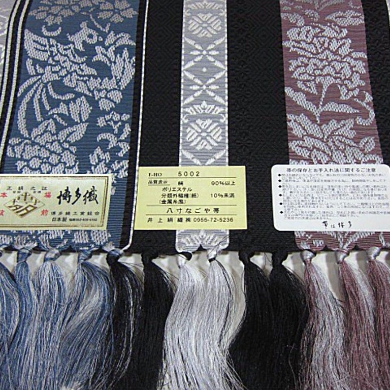 新品未仕立   正絹 本場筑前博多織八寸名古屋帯です。品質は、正絹90% ポリエステル・分類外繊維10%です。『博多織の起源は、焼く七百六十余年前、博多の満田弥三右衛門が栄に渡り、漢織・呉織等の技術を取得し、帰朝して伝えたことに始まります。満田弥三右衛門から焼く三百六十年後、竹若伊右衛門が始めて帯地を織り出し、博多織と名づけたといわれております』博多織の帯は締めやすく、それでいて一度締めると緩みにくいことに定評があり、この扱いやすさこそが博多織の魅力です。着こなしを上品に盛り上げてくれる一品かと思います。織り上がったばかりのお品です。