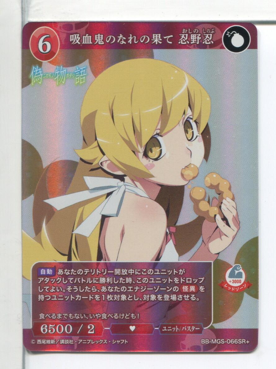 | ビルディバイド 物語シリーズ 吸血鬼のなれの果て 忍野忍 SR+カードです。スレなどの傷みがあります。注意事項と発送詳細(送料)をご確認のうえ、ご入札をお願いいたします。 ※カード番号は下記の通りですが、記載ミスがあるかもしれませんので画像で最終確認をお願いいたします。 BB-MGS-066SR+ |