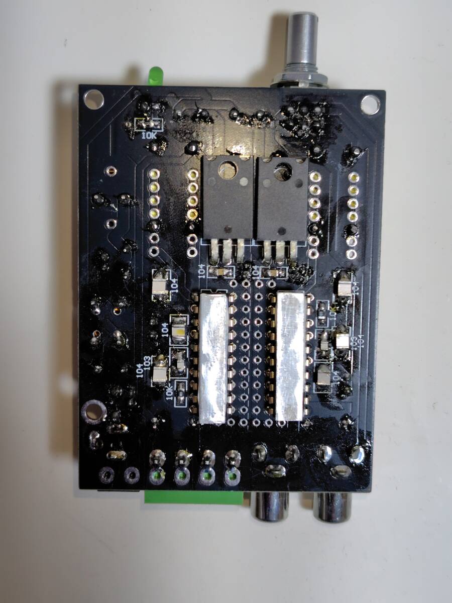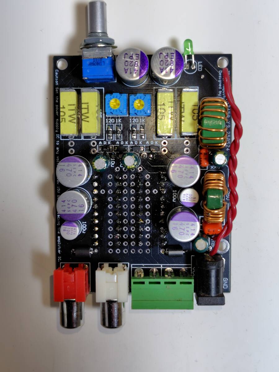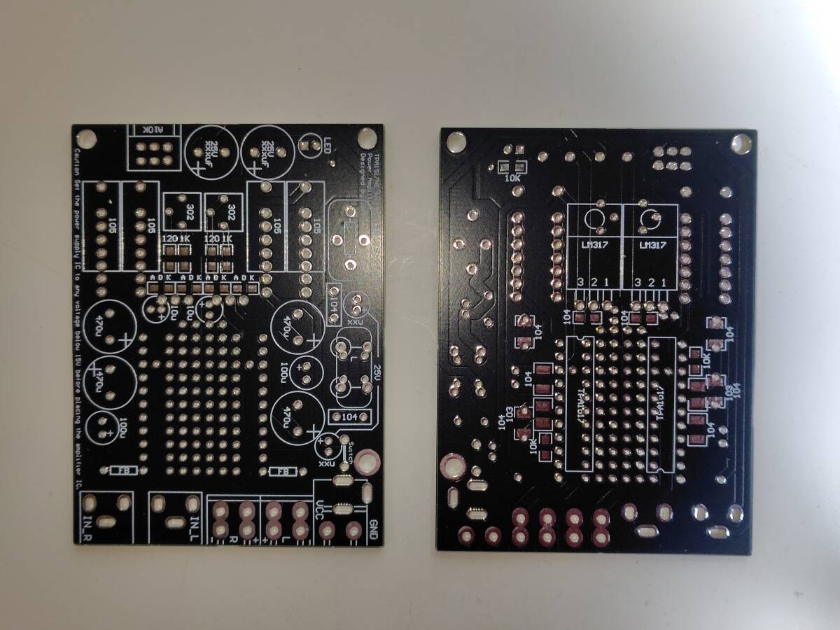 組み立ての手順としてはLM317周辺と前側の470uFまで組み立てた後電源電圧を設定した後アンプICの取り付けとなります。電圧設定の際は470uFのコンデンサの耐圧を超えさせることの無いよう慎重に行ってください。