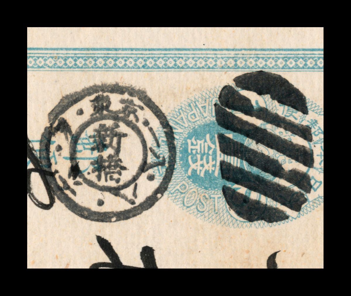 K21 東京支局大型ボタ印|小判1銭紙幣寮銘葉書 二重丸型印:新橋/東京・一八・八・六・ヲ 裏紙片付着 エンタイア