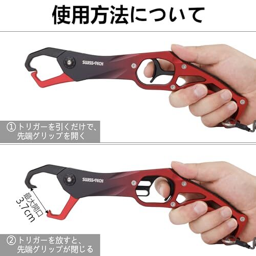 【使用方法について】①トリガーを引くだけで、先端クランプを開く。②トリガーを放すと、先端クランプが閉じる。これで確実に魚をキャッチします!動作がスムーズで簡単なので片手でも操作することができます。