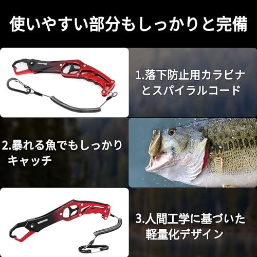【アーチ構造とロックデザイン】デザインに実用性を考えた頑丈なアーチ構造を採用して中・大型魚を掴むだけでなく、リリース時に魚へのダメージが最小限に抑える構造となります。ロックが強いので掴んだ魚を逃せなかったり、安全面に使わない時に誤操作を防止したりして使いやすさも追求しました。釣果の記念撮影に必要の道具となります。