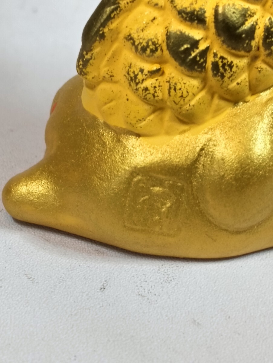 口にくわえた「金運招来」のお札が、そのパワーをさらに高めています。