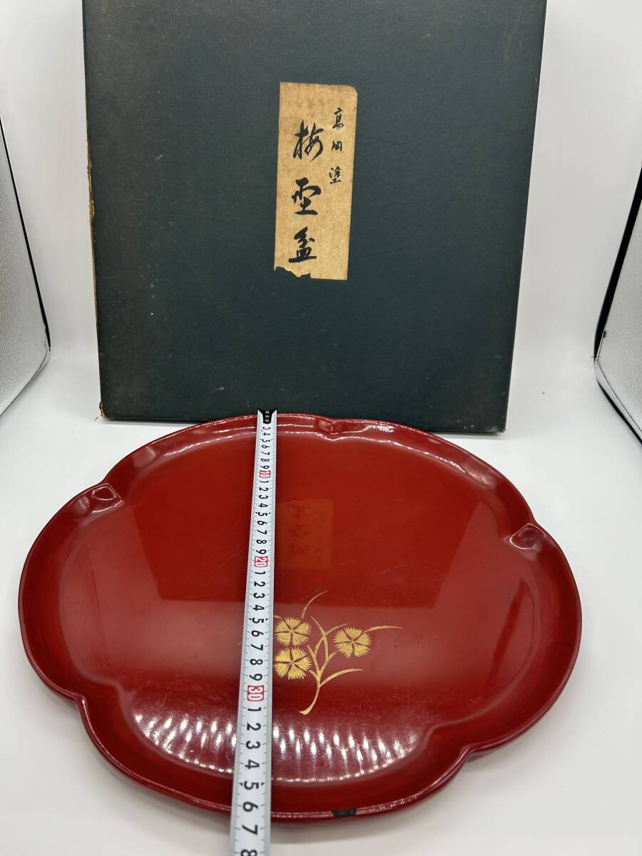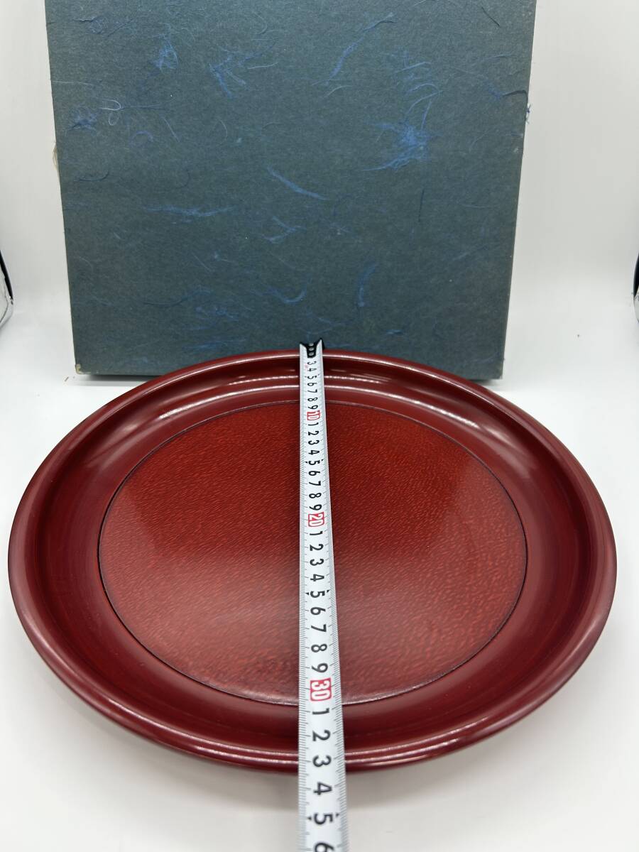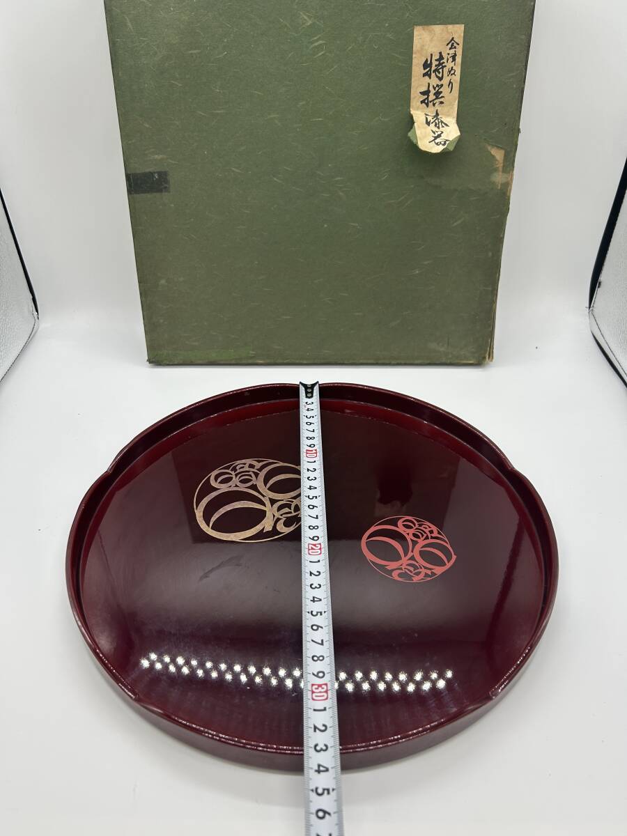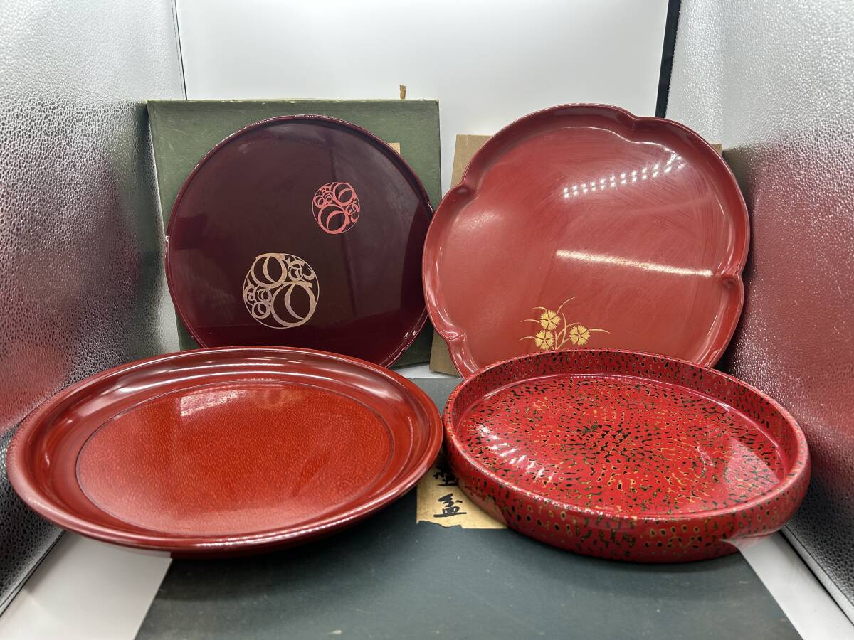 H254☆ お盆4点セット 尺胴張丸盆 漆塗 津軽塗 無形文化財 唐塗朱楊 会津塗 敷盆 トレイ カシュ―塗装 和食器 天然木 各箱付き