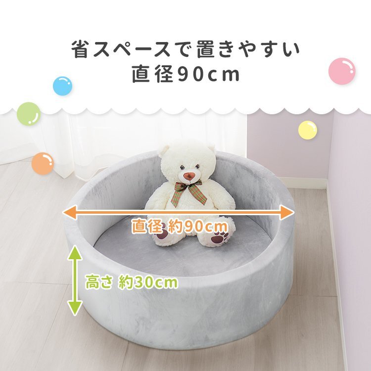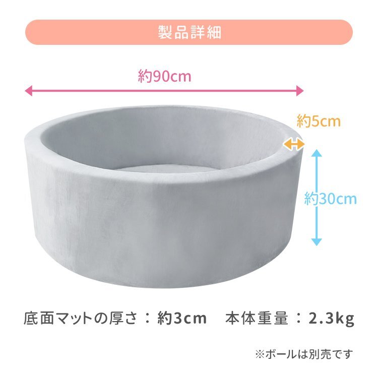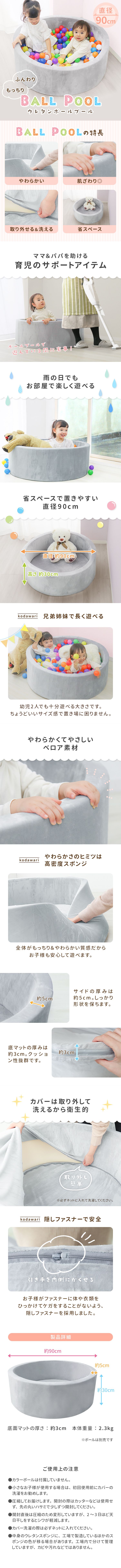 全体がもっちり&やわらかい質感で安心して遊べます。 直径90cmとコンパクトサイズなので、省スペースでも使えます。 幼児2人でも十分遊べる大きさなので、兄弟姉妹仲良く遊べます♪ サイドの厚みは約5cm・底マットの厚みは約3cm! 丸みのあるデザイン&優れたクッション性で、安全性抜群です。 カバーは取り外して洗えて衛生的です。 また、高密度ウレタンを使用し耐久性抜群です。 雨の日でもお家で楽しく遊べる場を実現します。 【商品詳細】 サイズ:(約)90cm×30cm 重量:(約)2.3kg ※カラーボールは別売りです |