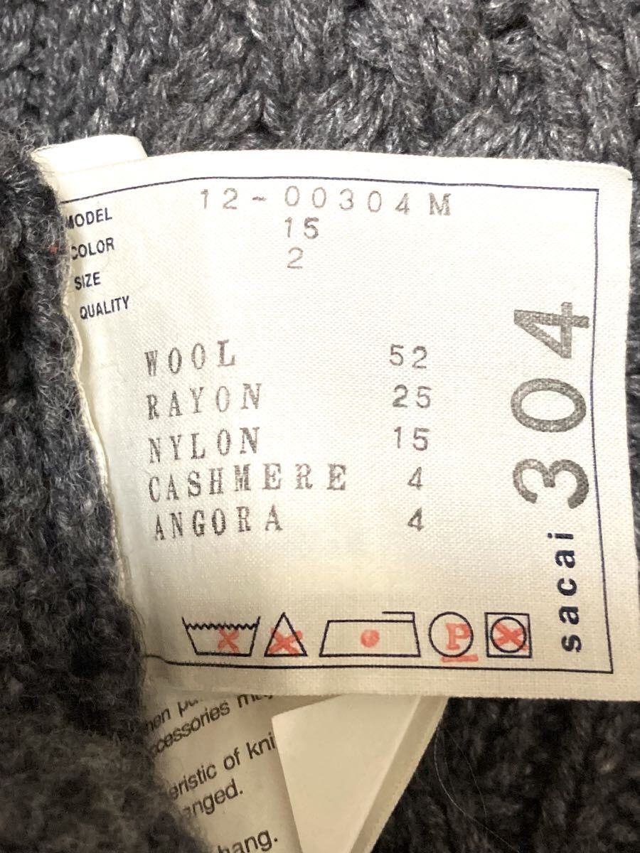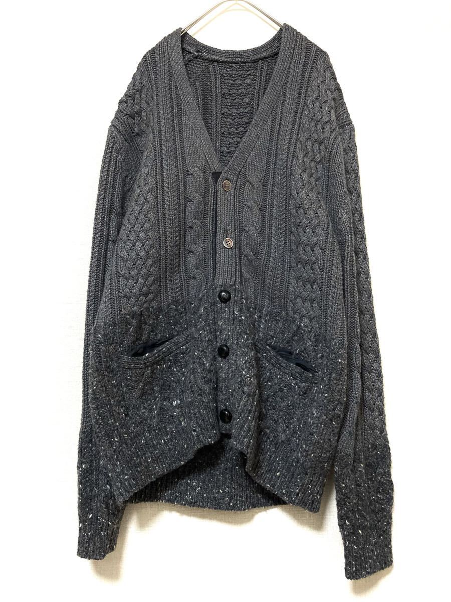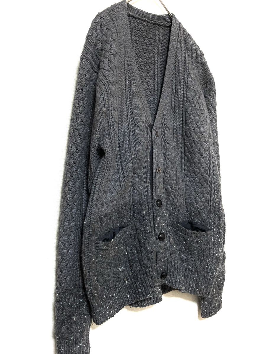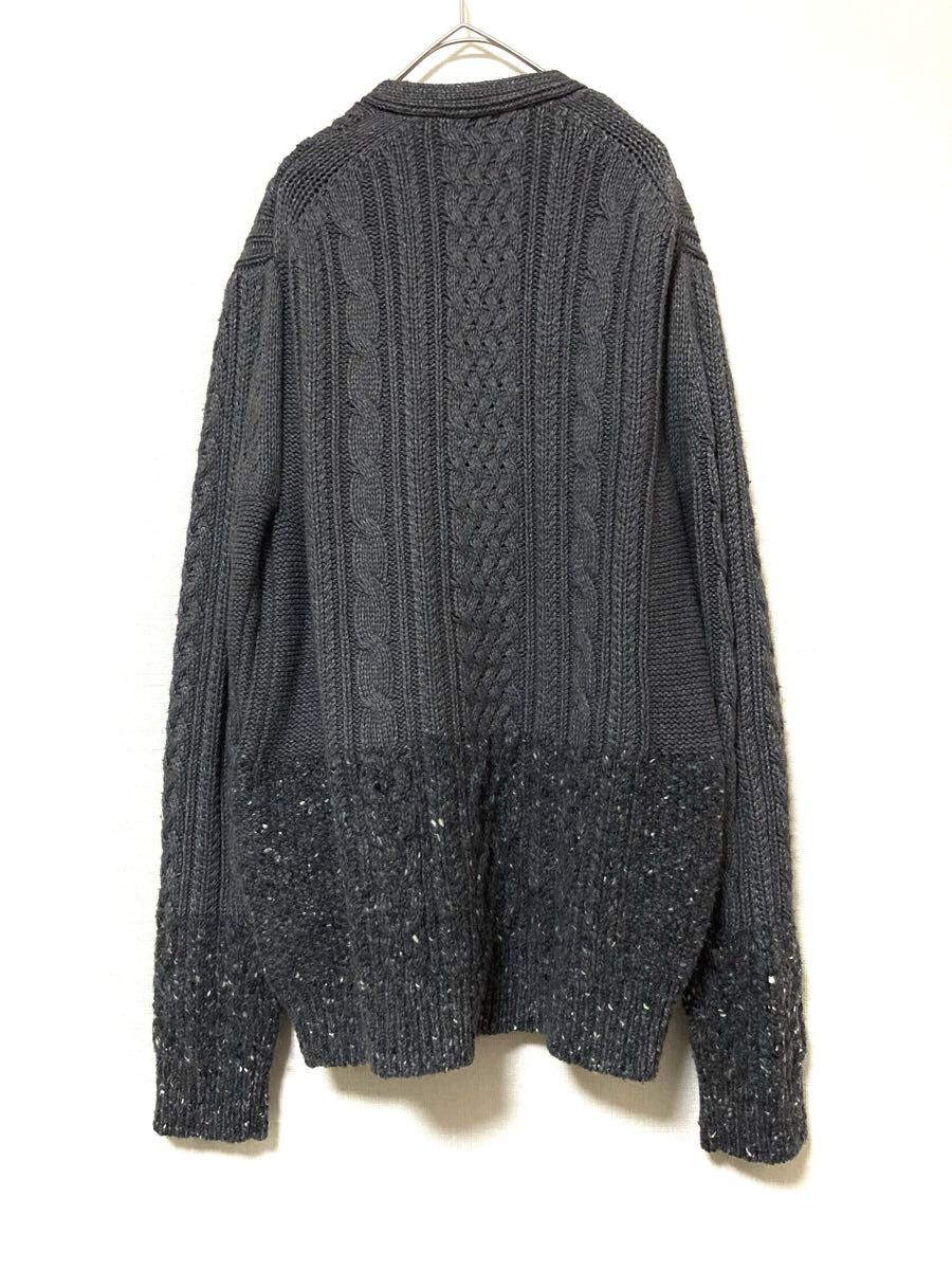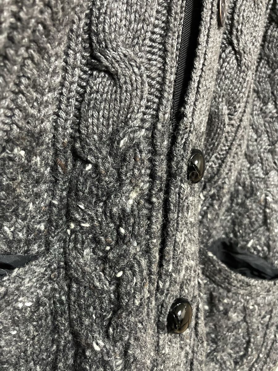 ケーブル編みのカーディガンの裾と袖口が異なる糸・編み方に切り替わったドッキングしたようなデザインのアイテムです。