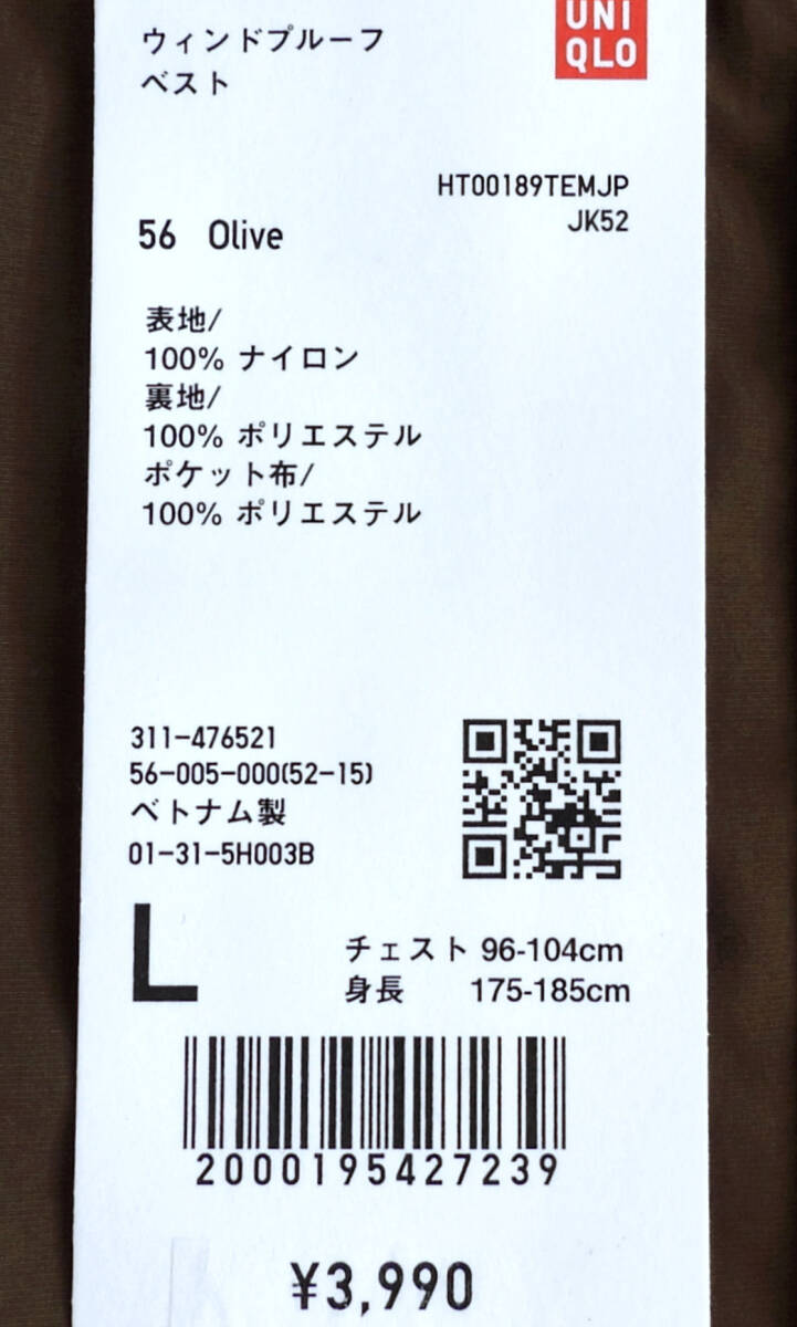 ユニクロ UNIQLO ウインドプルーフベスト メンズ Lサイズ オリーブ【新品未使用】