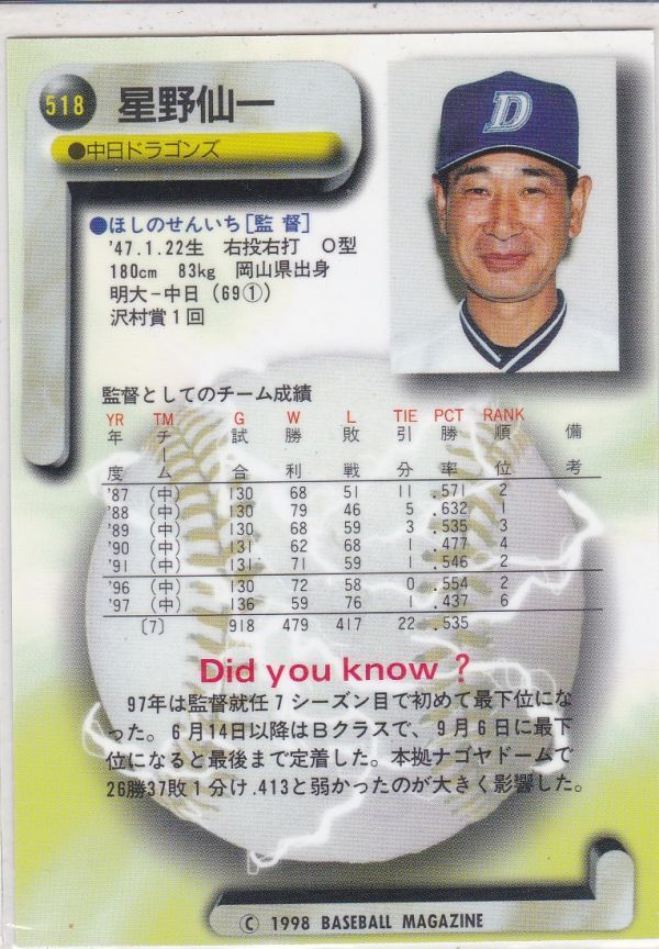●1998BBM 【星野 仙一】 監督:BASEBALL CARD No.518:中日 R2