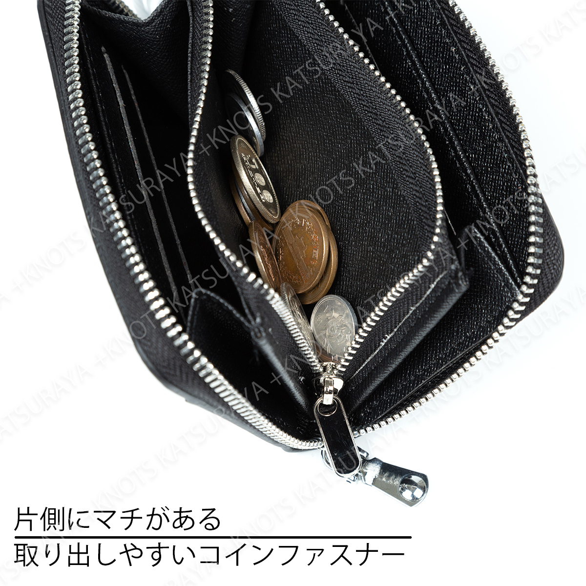 表面は独特な光沢で高級感があるカーボンレザーのミニ財布です。カードポケットが内側に4か所と外側にひとつあり、よく使うカードは外側に入れると便利です。マチのある小銭入れはL字に大きく開きます。