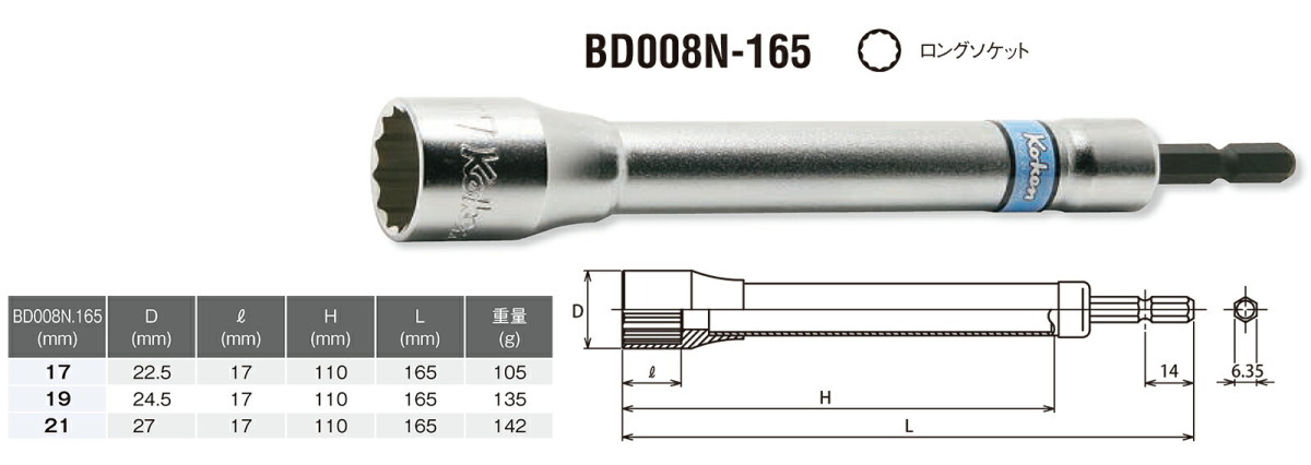 〈コーケン〉ロングリードソケット 21ミリ BD-008N.165-21