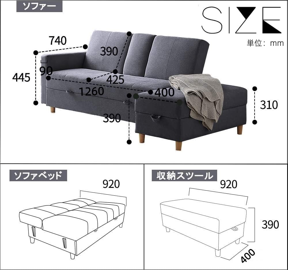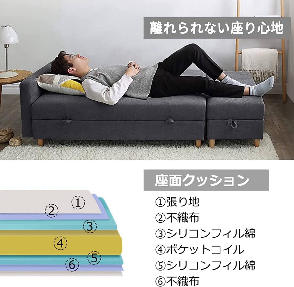 この商品について: ◎01たくさん収納できるオットマン ◎02ダンパー付きで楽々 ◎03ダブルカウチタイプ ◎04ソファベッドタイプ ◎05肌触りの良いファブリック生地 ◎06離れられない座り心地 ◎07座面クッション 商品の説明: ◆ 01たくさん収納できるオットマン 大容量収納つきのオットマン。 衣類やお子様の玩具収納にも大活躍です。 収納容量:横幅87cm×幅38cm×奥行き13.5cm ◆ 02ダンパー付きで楽々 スツールはダンパー付きで開閉も力がいらず楽々。お子様や女性の方も安全です。 レイアウト自由自在 L字タイプ 寝転がっても余裕の広さで、ゆったり足を伸ばせます。 読書やゲーム、テレビをみたりとお好きな時間を心地よく過ごせます。 ◆ 03ダブルカウチタイプ 大人ふたりが足を伸ばして横になれ、さらにもう一人座れる実用性の高いレイアウトです。 一人の時は自由にごろごろ、大切な人と二人でもゆったりくつろぐことができます。 ◆ 04ソファベッドタイプ シングルサイズのベッドほどの大きさがあり、ゆったりとくつろげます。 ◆ 05肌触りの良いファブリック生地 ファブリックは肌触りも良く通気性に優れ、一年通して快適にお使いいただけます。 ◆ 06離れられない座り心地 ソファーで大事なのは座面の座り心地。 優しい沈み込みもありながら、安定感もある硬さなので、テレビを見る時など、身体を自然と負担のない姿勢に導くことで、長時間座っても疲れにくいです。 ◆ 07座面クッション ①張り地 ②不織布 ③シリコンフィル綿 ④ポケットコイル ⑤シリコンフィル綿 ⑥不織布 ⑦張り地 ◆ 08すすめポイント ソファ×ベッド、1台2役、ワンルームなど省スペースの使用には最適です! 背もたれは収納可能なドリンクホルダーつきのセンターテーブルに早変わり。 背もたれのリクライニングは3段階で調節が可能。 座面下には便利なスライドレール仕様の引出しを設置。 大容量収納付きのダンパー付きのオットマン。 レイアウト自由自在 肌触りの良いファブリック生地 優しい沈み込みと安定感のある硬さで、長時間座っても疲れにくい。