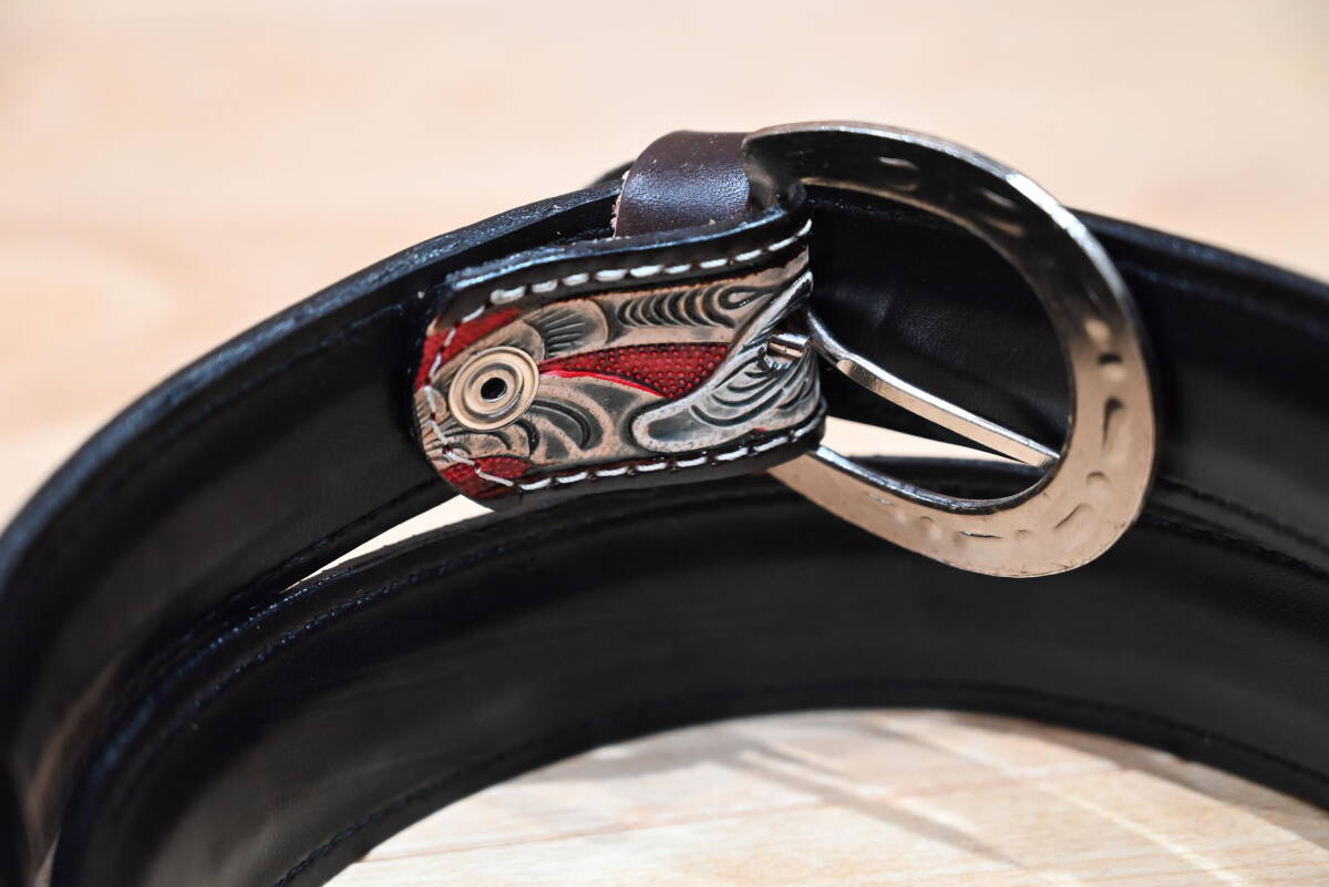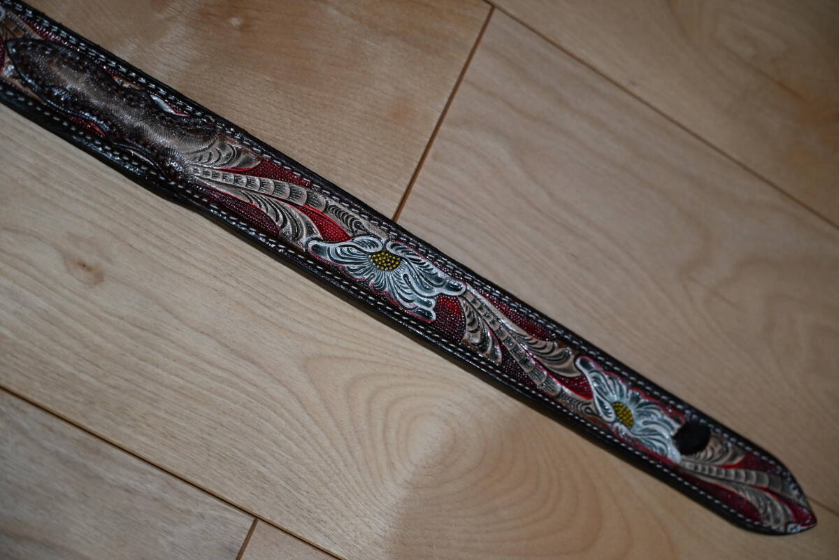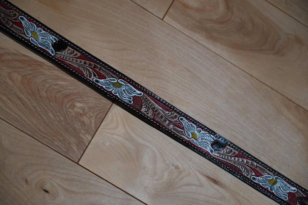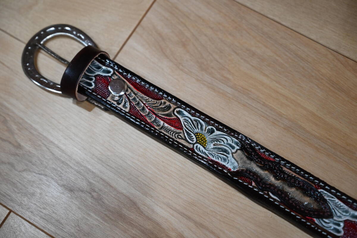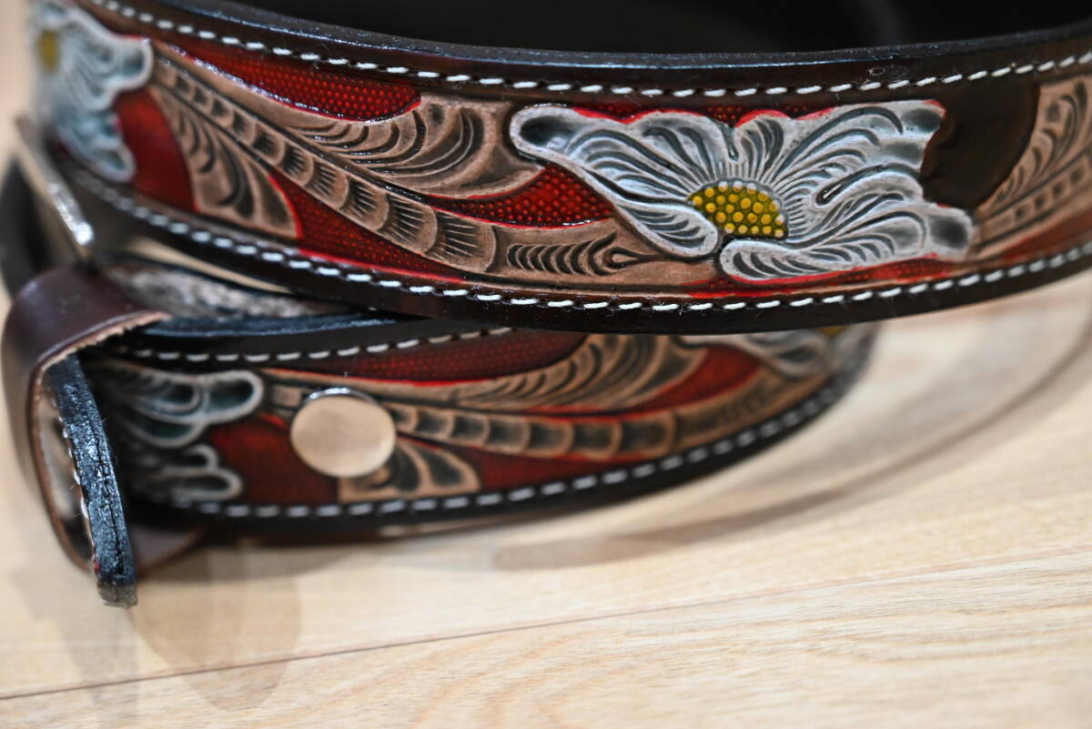 商品説明 | 牛革で作成した、カービング柄 ウエスタン調ベルトです。 色は茶ベースに、赤・茶・白・黄色でペイント仕上げをしています。未使用品になります。 サイズは、ベルト本体は116㎝、幅は3.7㎝、バックルは約6㎝程になります。 3つのパーツを組み合わせて作成しています。全体に植物の茎と花弁を表現しています。ペイント仕上げがカラフルな印象になっています。表と裏地の間には、穴あけ用の芯を入れていますので、強度が付くように仕上げてます。厚さは約4㎜程になります。 バックルの部分は、ボタンタイプなので、交換も可能になっています。本体と合うように馬蹄型のバックルを付けています。 ベルトの穴あけは、購入者の方にお願いします。フリーサイズで可能になるよう当方では加工無しの状態で出品致します。 発送は、定形外郵便を利用します。送料は、660円になります。 こちらは、ハンドメイドなので、多少の傷や汚れ等はご了承下さい。細かい点まで、気になる方はご遠慮下さい。 |