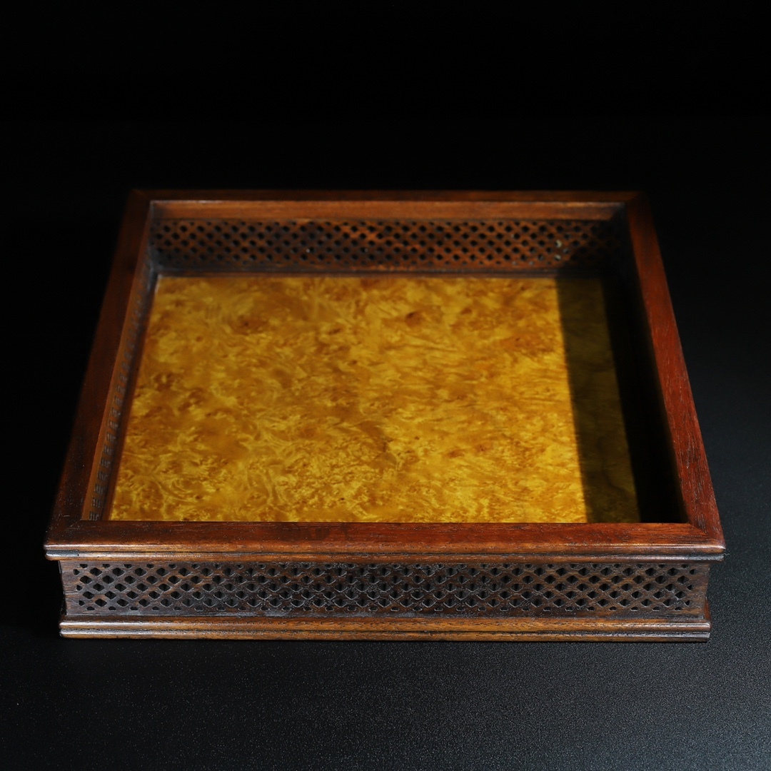早期收集 古花梨木彫 空彫 四方 茶托 茶盤 托盤 收納盤 文案置物 擺件 時代物 骨董品 旧家蔵出し 唐物 中国古玩 古美術品
