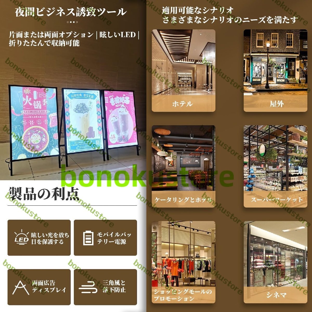 機能的特徴: LED電飾スタンド看板 輸入された LED ランプコアと専門的な導光板、均一な照明と省エネ、プラグアンドプレイ、眩しさと目の保護。両面表示に対応し、広告効果が倍増します。独自の折りたたみ収納設計により、持ち運びや収納が簡単で、1秒で広げてすぐに使用できます。防風・防水バッグを装備し、安定性をさらに高めます。