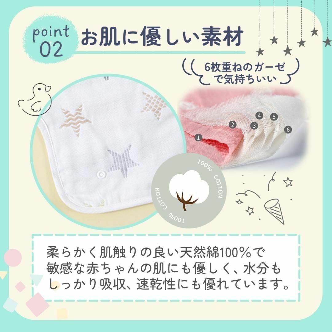 【吸水性・速乾性抜群】吸水性が高く速乾性があるため、よだれや汗を素早く吸収し、赤ちゃんの快適さを保つ。